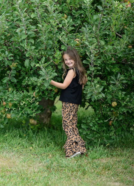 Girls leopard double ruffle Distressed denim pants