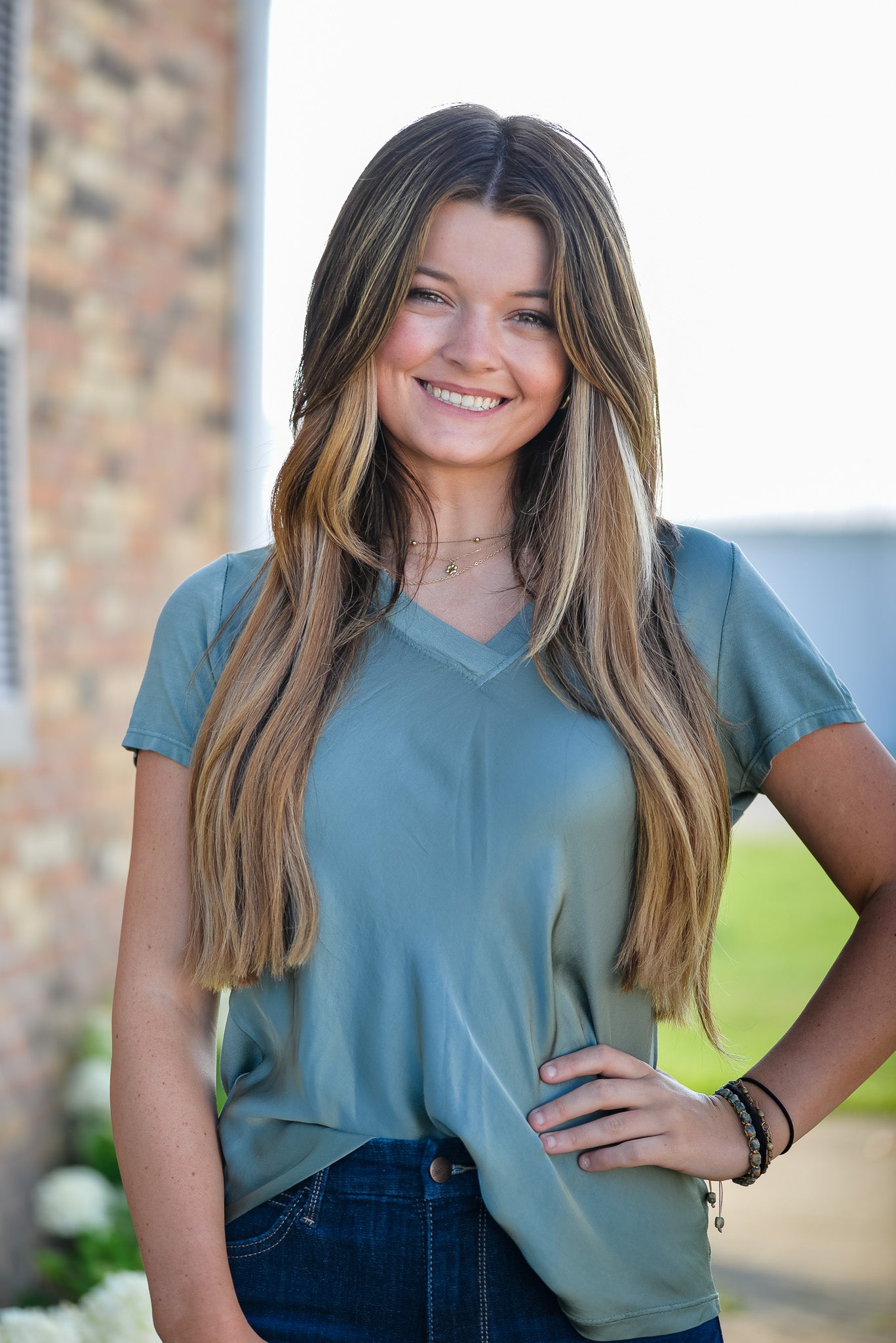 Your new go-to basic with a luxurious twist. This soft and silky V-neck tee in a calming sage green is perfect for wearing on its own or layering under your favorite jackets and cardigans. Made with love by Scandal Italy.