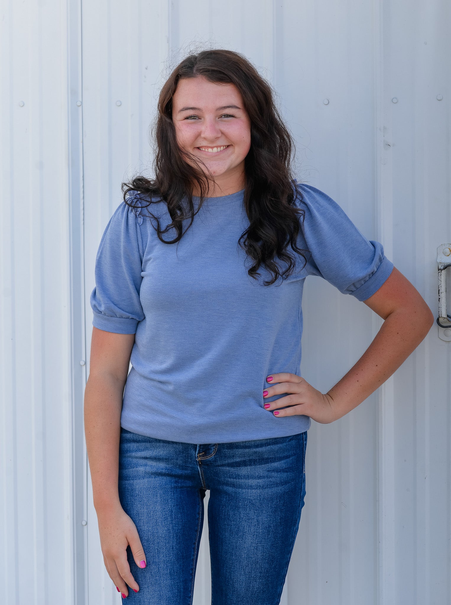 CREW NECK, HALF PUFF SLEEVE WITH RUFFLE SHOULDER, SOLID TERRY TOP