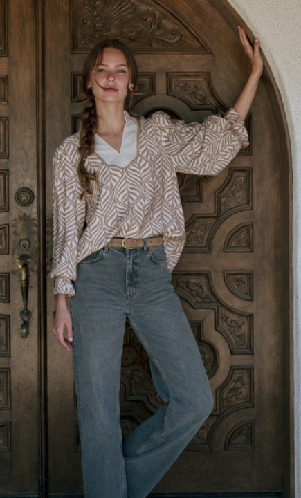 Elevate your everyday style with this boho-inspired leaf print top, designed with a perfect mix of comfort and detail. Featuring 3/4 sleeves and a standing collar neckline, this blouse blends casual ease with chic sophistication. The solid contrast accents and delicate lace trim detailing add a feminine touch, while the lightweight fabric ensures breathable comfort for all-day wear. Pair it with jeans, trousers, or skirts for a versatile look that transitions seamlessly from day to night.