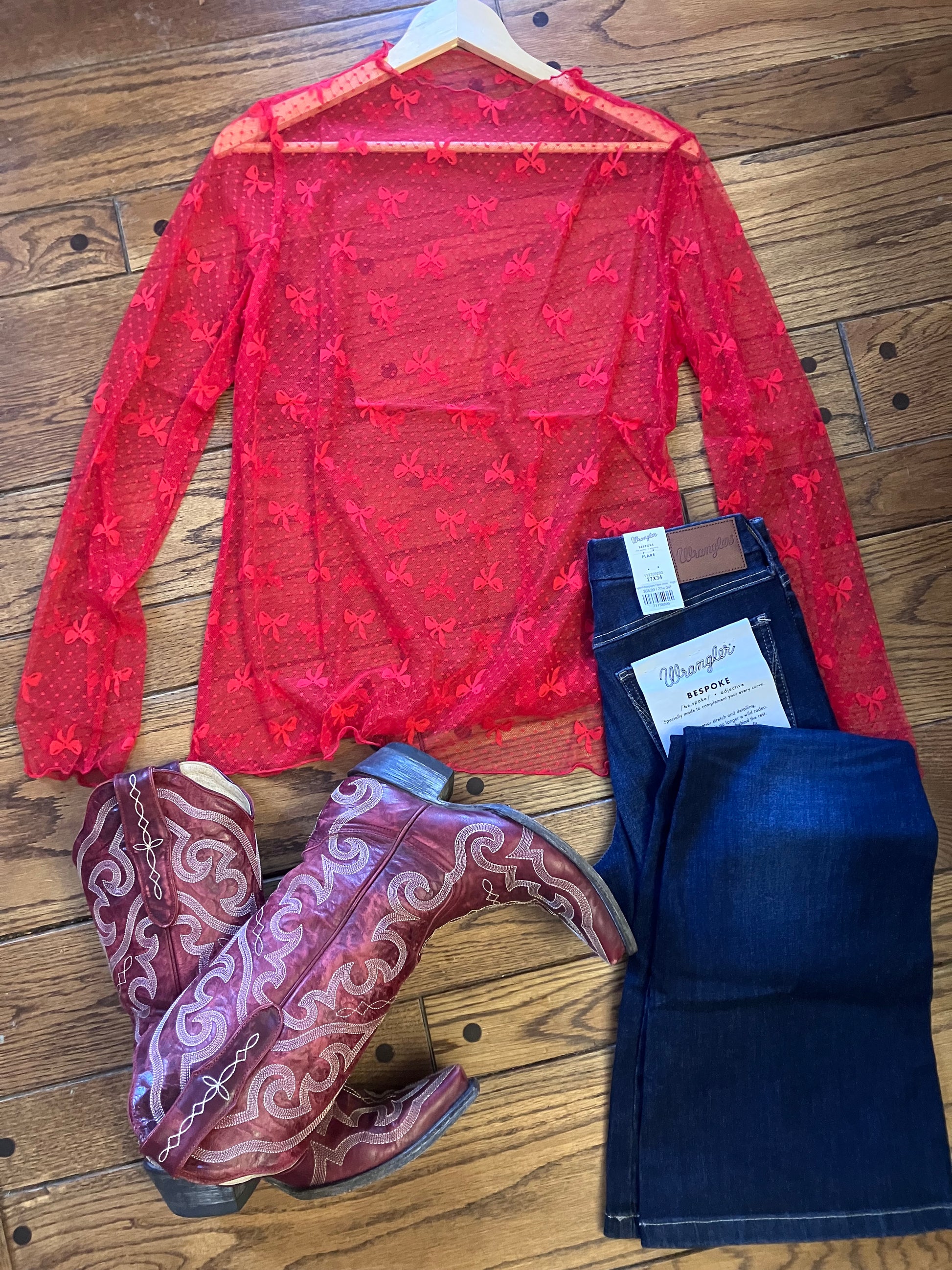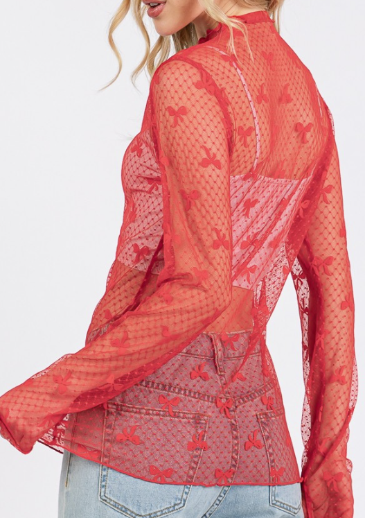 Elevate your wardrobe with this charming Bow Print Long Sleeve Lace Top in Red. Featuring a delicate bow print design, this top is crafted from lightweight, breathable fabric with intricate lace detailing for an elegant and feminine touch.