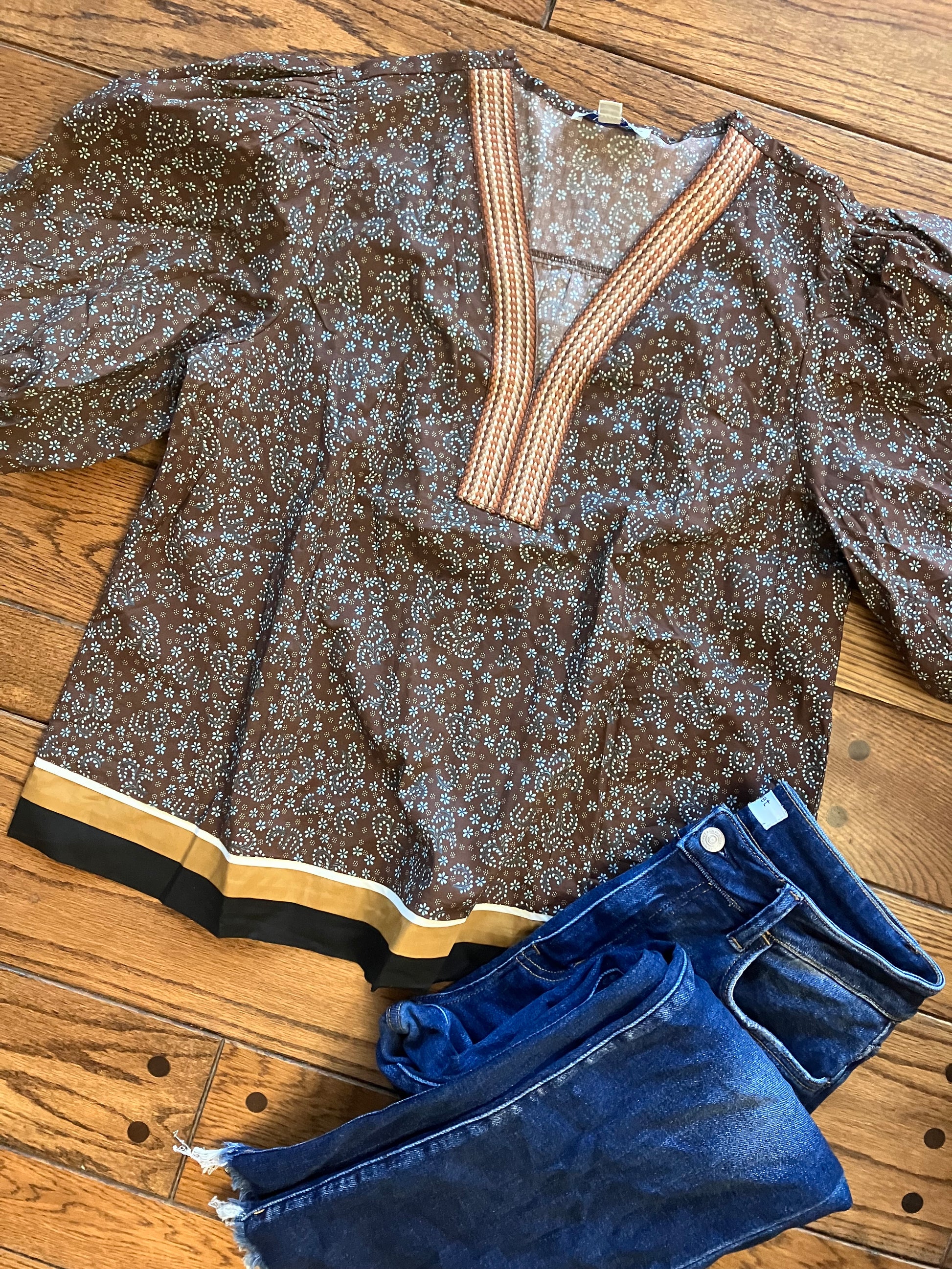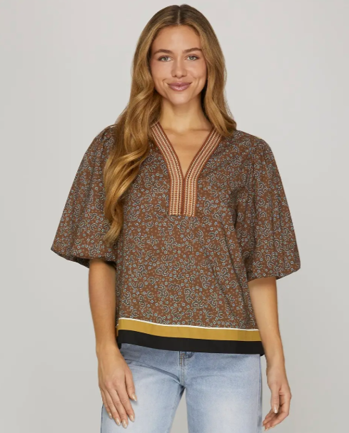 Puff Sleeve V-Neck Printed Top with Color Block Hem