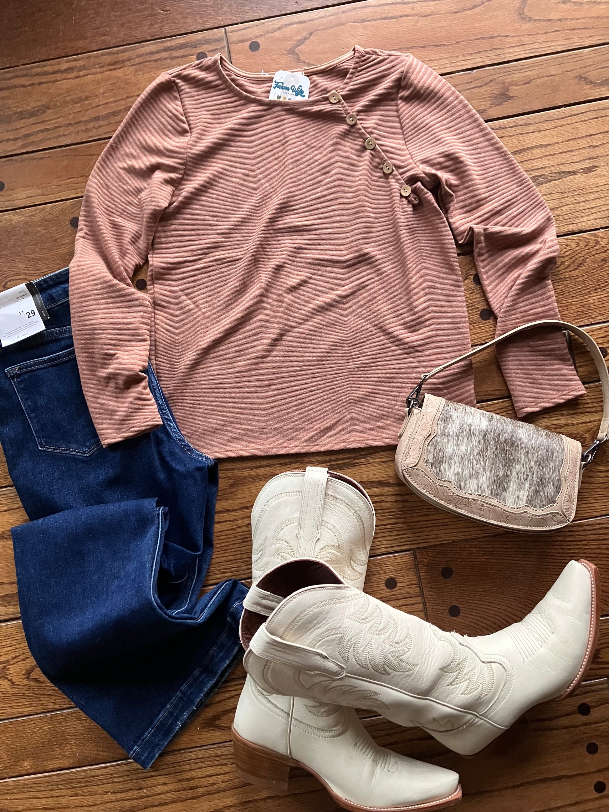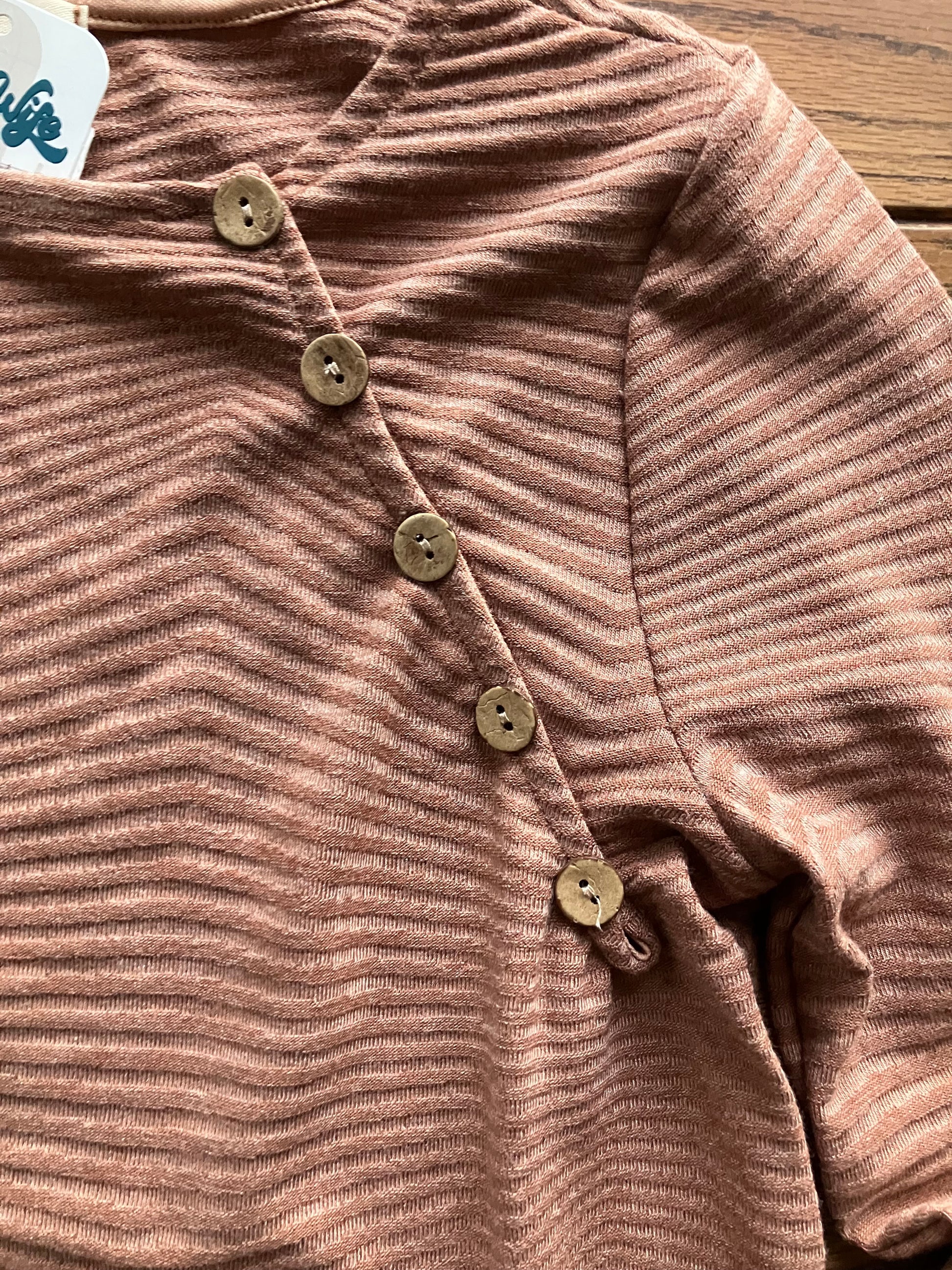 The Brewster button top is a camel colored diamond ribbed top with a simple side button detailing.