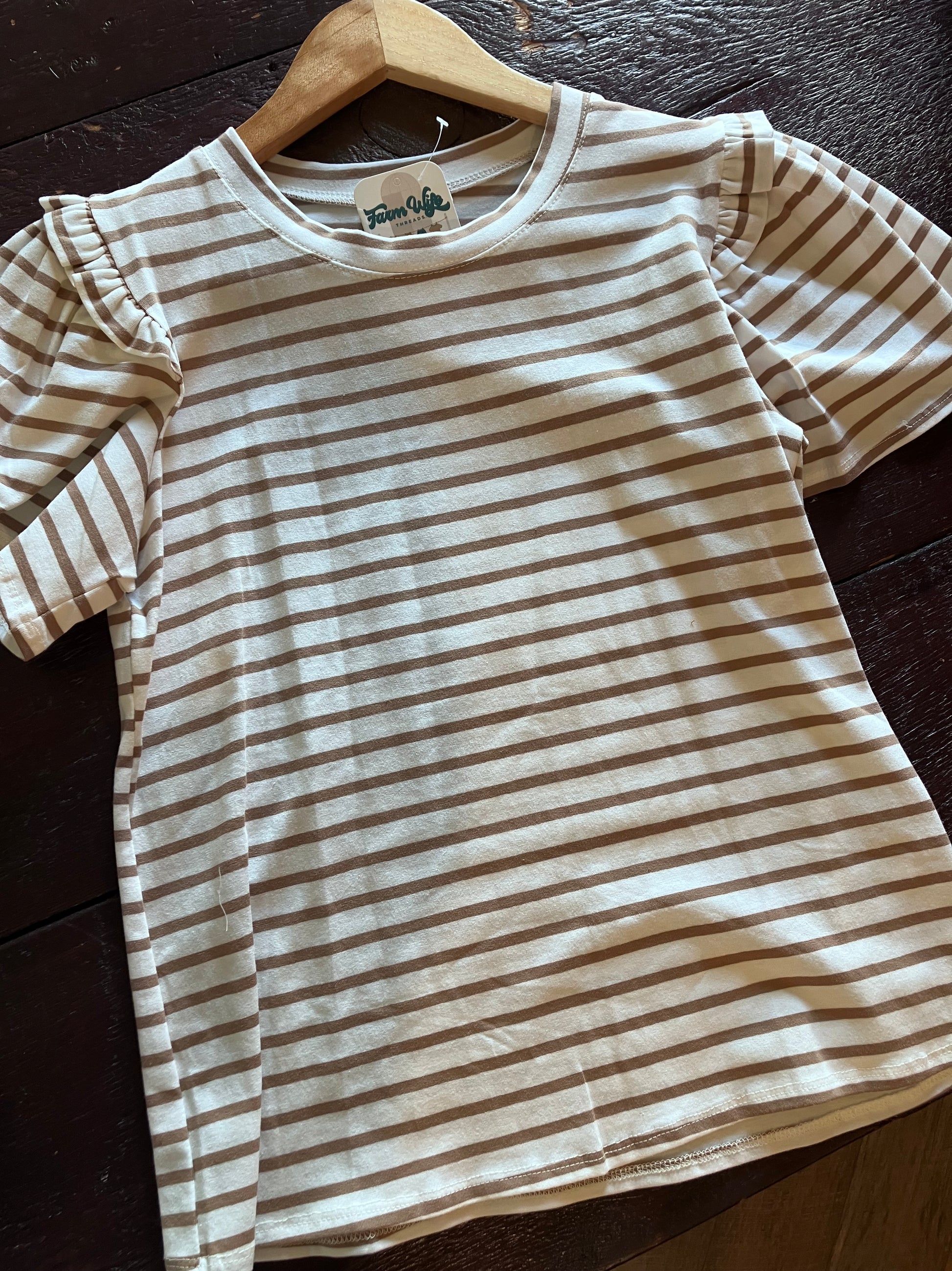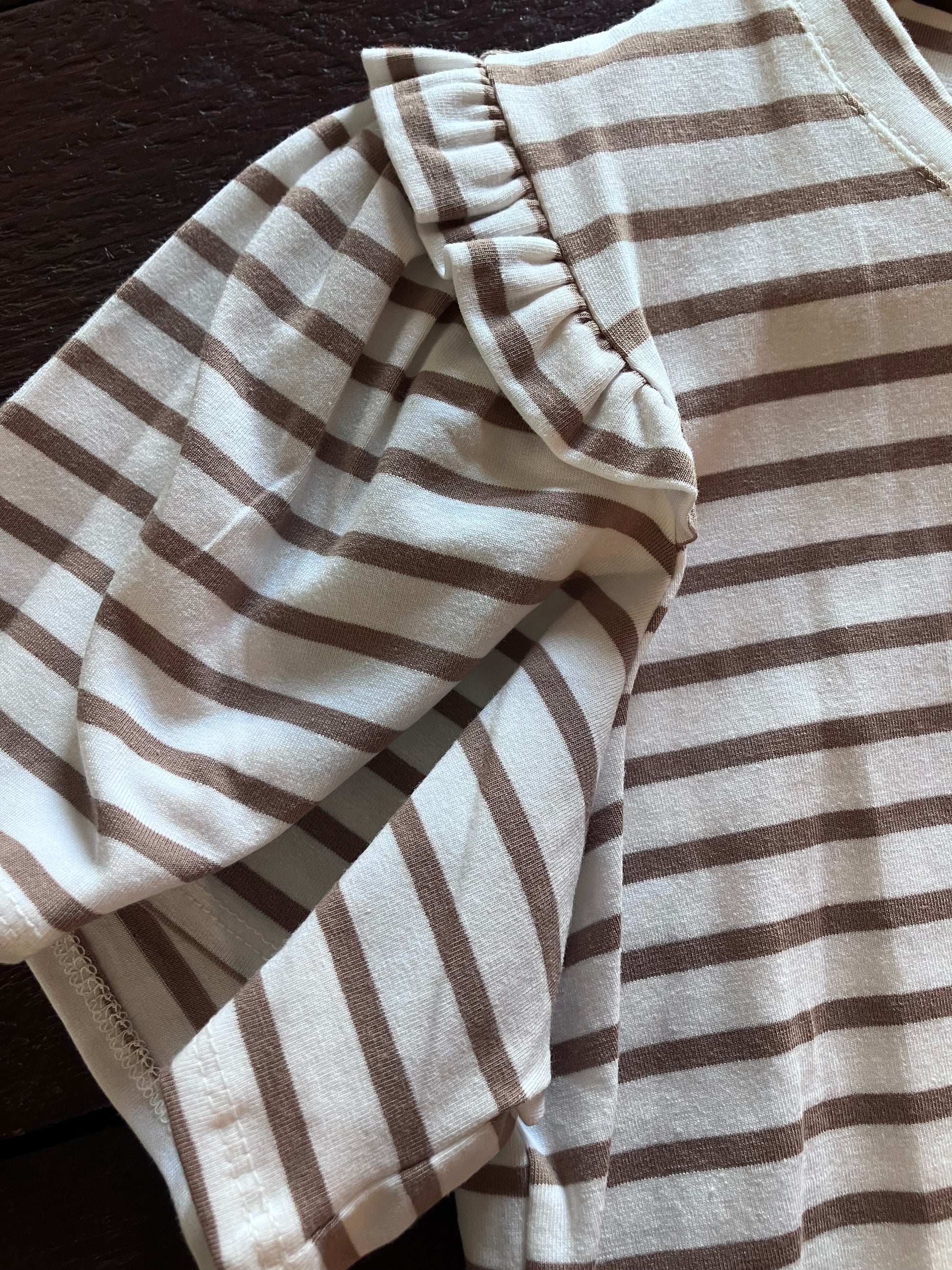 Add a playful twist to your everyday wardrobe with this Striped Top featuring ruffled detailed sleeves. Crafted from a soft and stretchy cotton-spandex blend, this top offers breathable comfort and a flattering fit. The delicate ruffle trim on the sleeves brings a touch of feminine charm to the classic striped design.