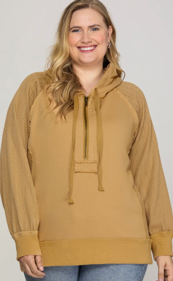 Stay cozy and on-trend with this Plus Size Contrast Sleeve Half Zip Hoodie. Featuring a half zip neckline, it allows for easy layering and versatile styling, while the drawstring hood adds a casual, sporty touch. The contrast sleeves elevate the look with a modern twist, making it more than just your basic sweatshirt.