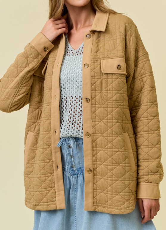 QUILTED SHACKET - Features a diamond quilted pattern for an elevated, textured look - Relaxed, oversized fit for comfortable layering over any outfit - Dual front chest pockets with button flaps add both style and function - Straight back yoke with subtle quilted detailing for a refined finish 100%POLYESTER | CONT:100%COTTON