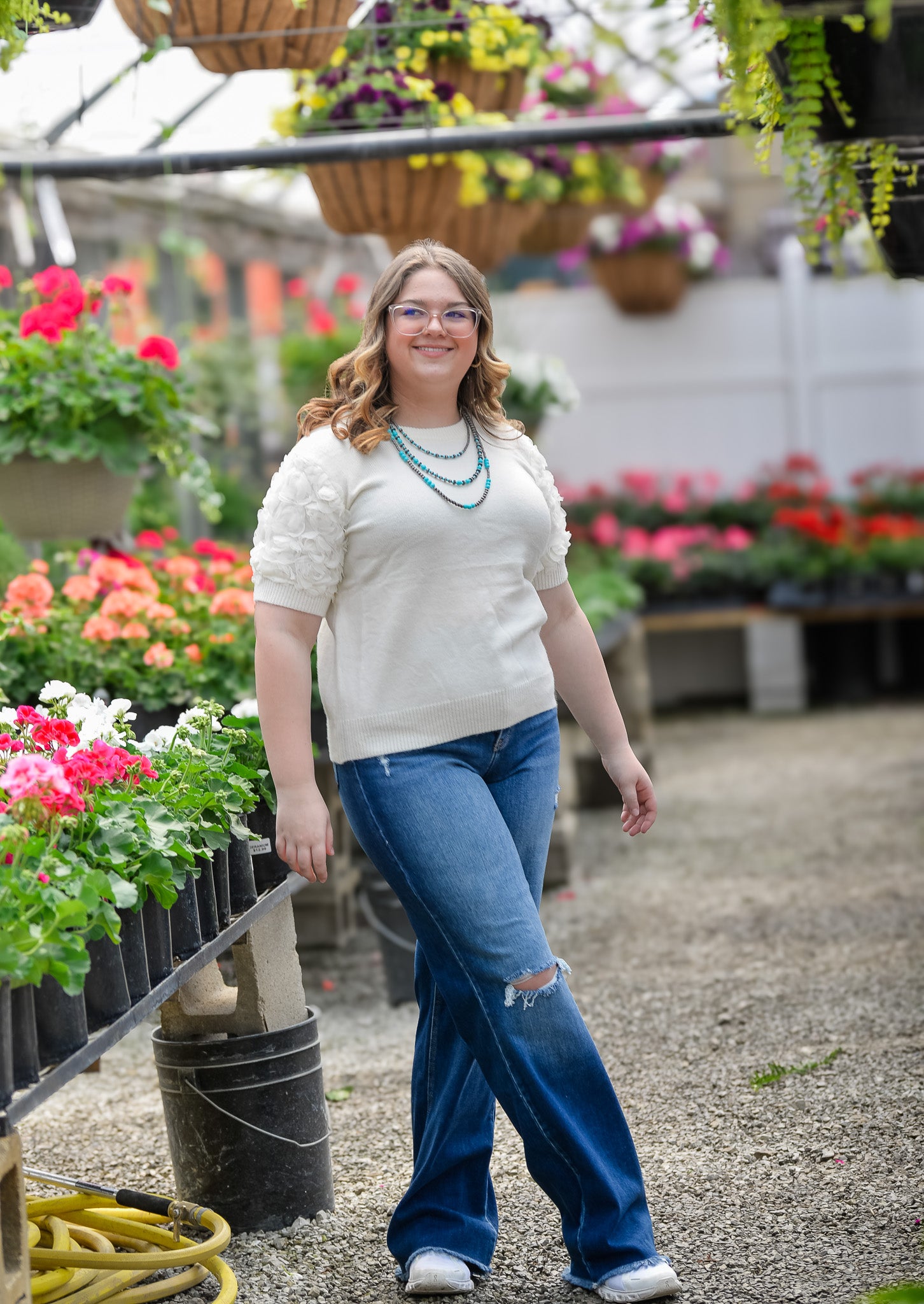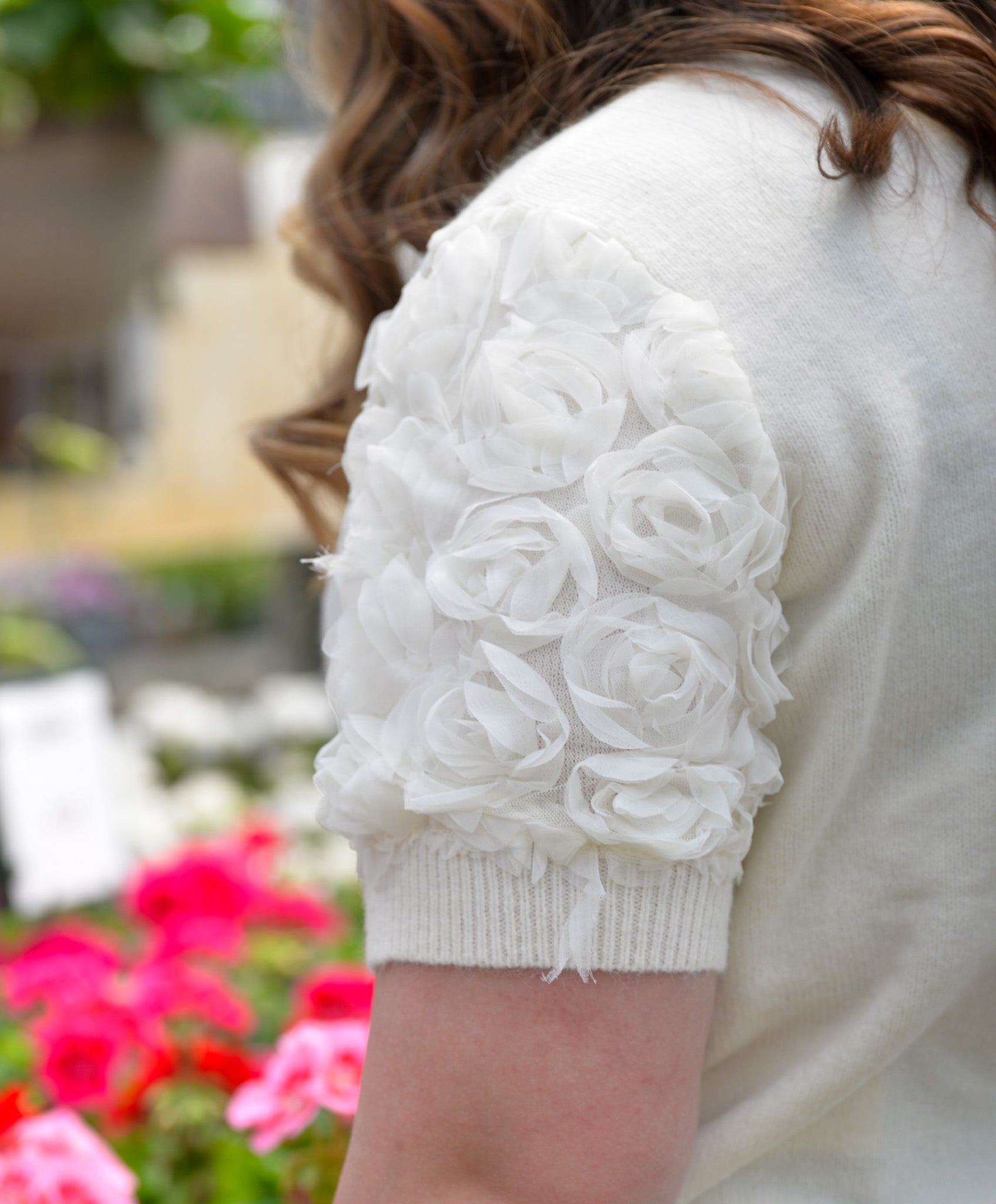 SOLID FLOWER APPLIQUE RIBBED SHORT SLEEVES KNIT TOP 42%ACRYLIC 30%PBT 28%NYLON