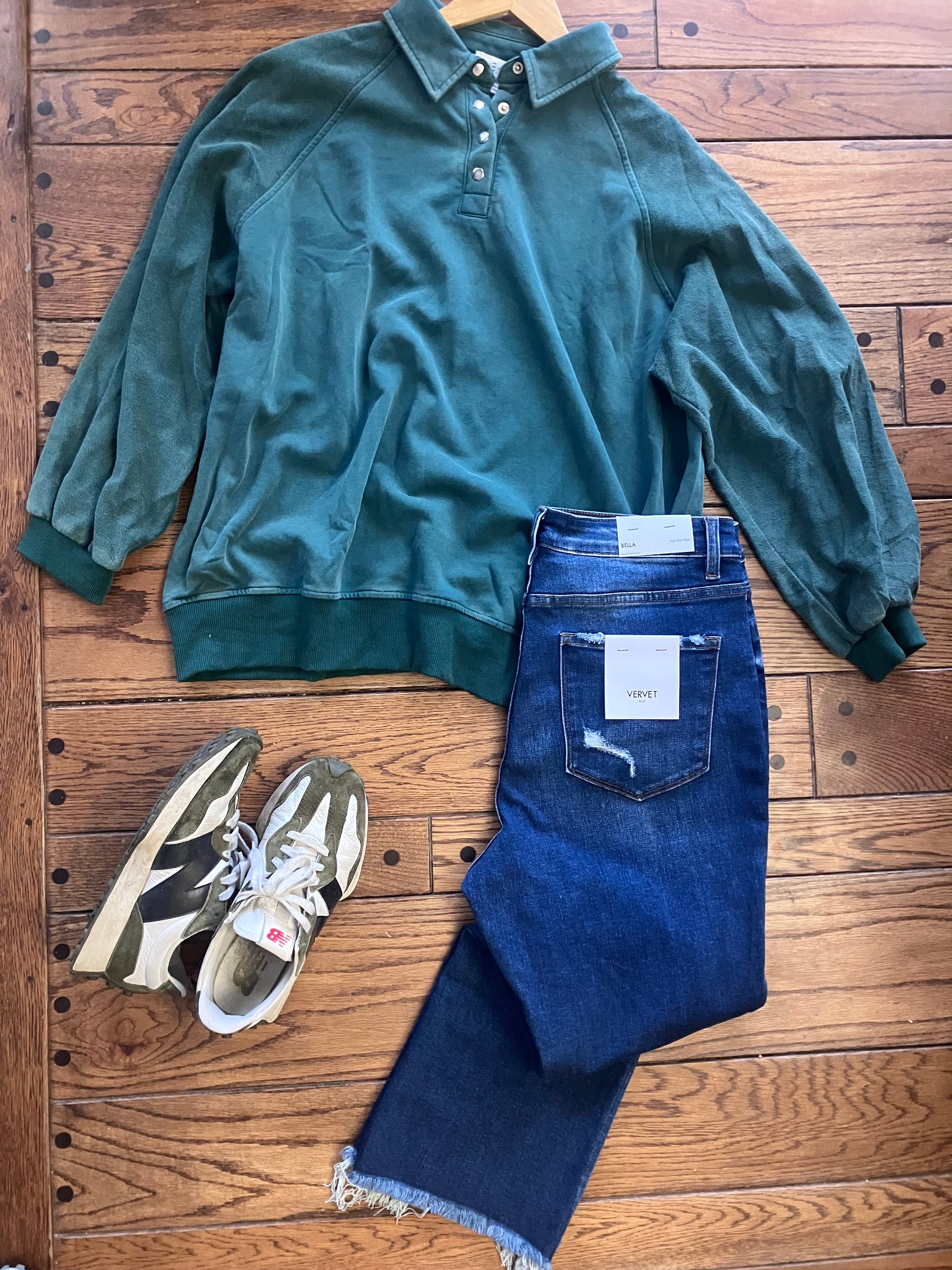 LONG SLEEVE SNAP COLLARED FRENCH TERRY WASHED SWEAT SHIRT IN EVERGREEN.