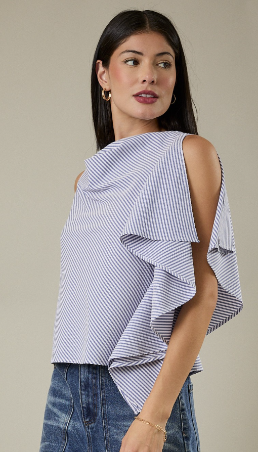 Elevate your everyday style with this effortlessly chic sleeveless top, featuring an eye-catching asymmetrical ruffle detail. Crafted from lightweight, breathable fabric, the design combines comfort with a modern twist. The classic blue and white stripe pattern brings a fresh, nautical-inspired feel—perfect for warm days or polished casual looks.