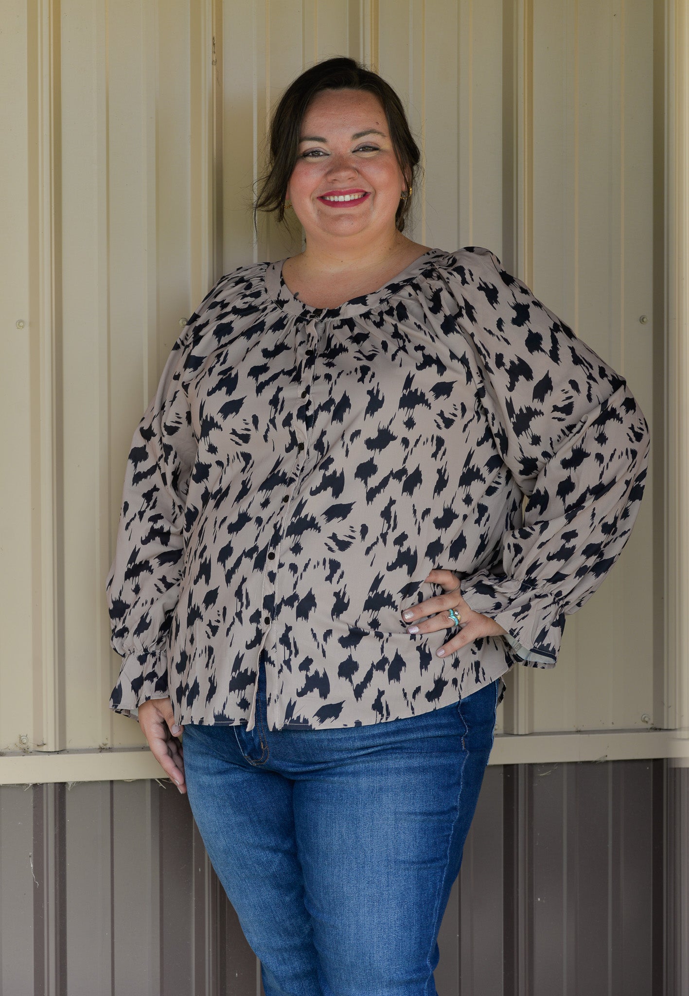 Add a touch of bold elegance to your wardrobe with this abstract print blouse, designed for style and comfort in plus sizes. Crafted from lightweight woven fabric in a neutral taupe base.