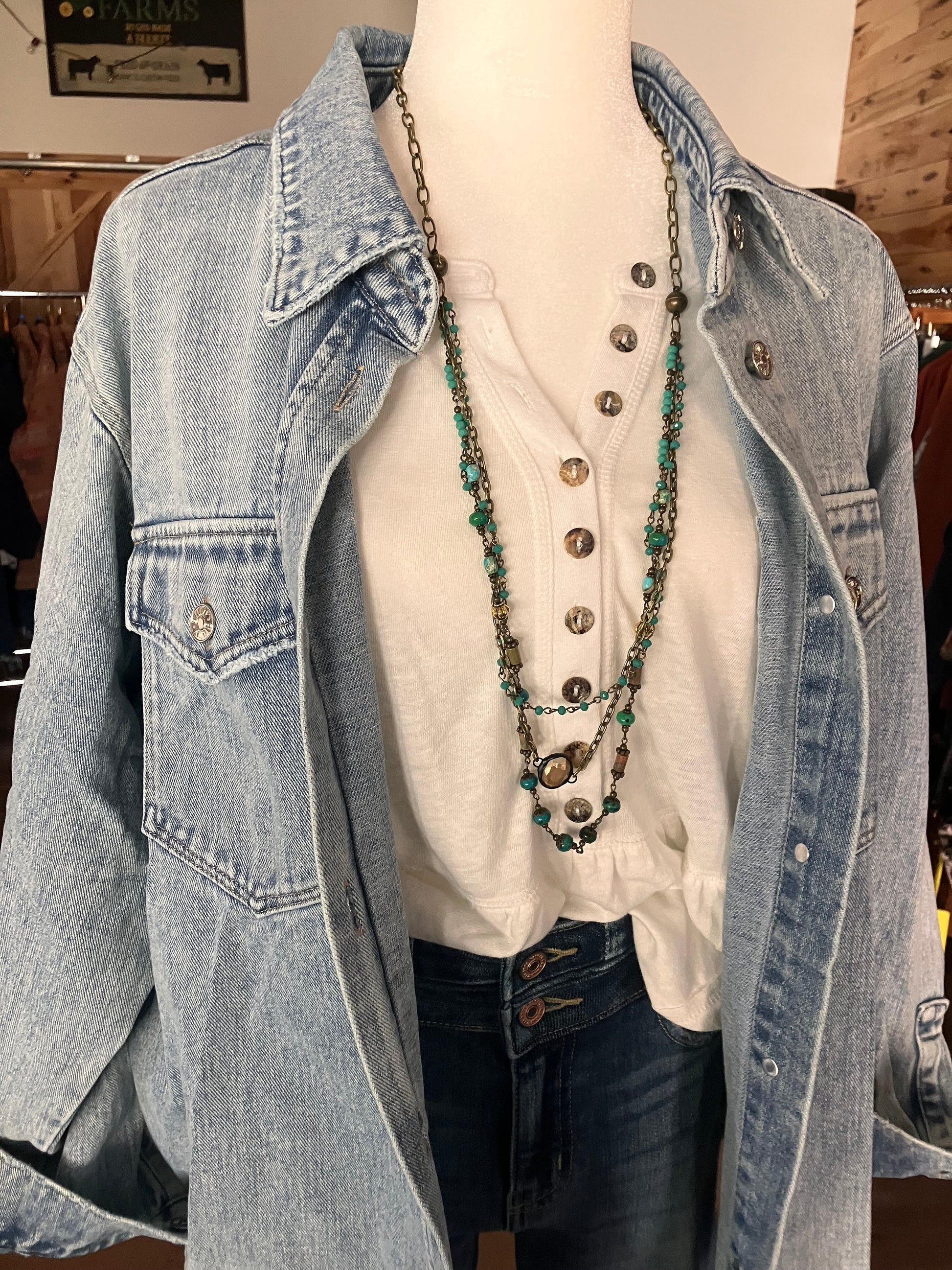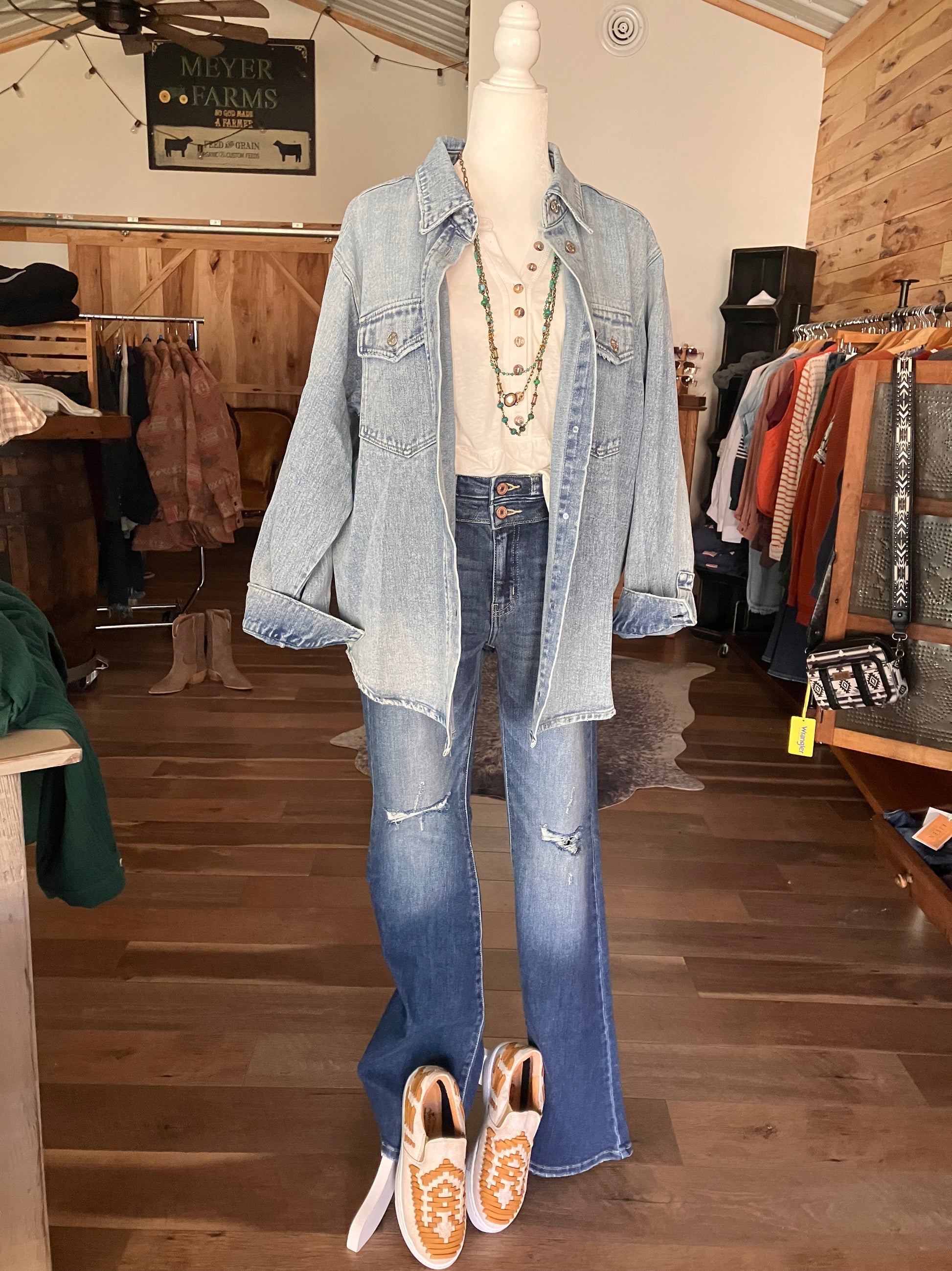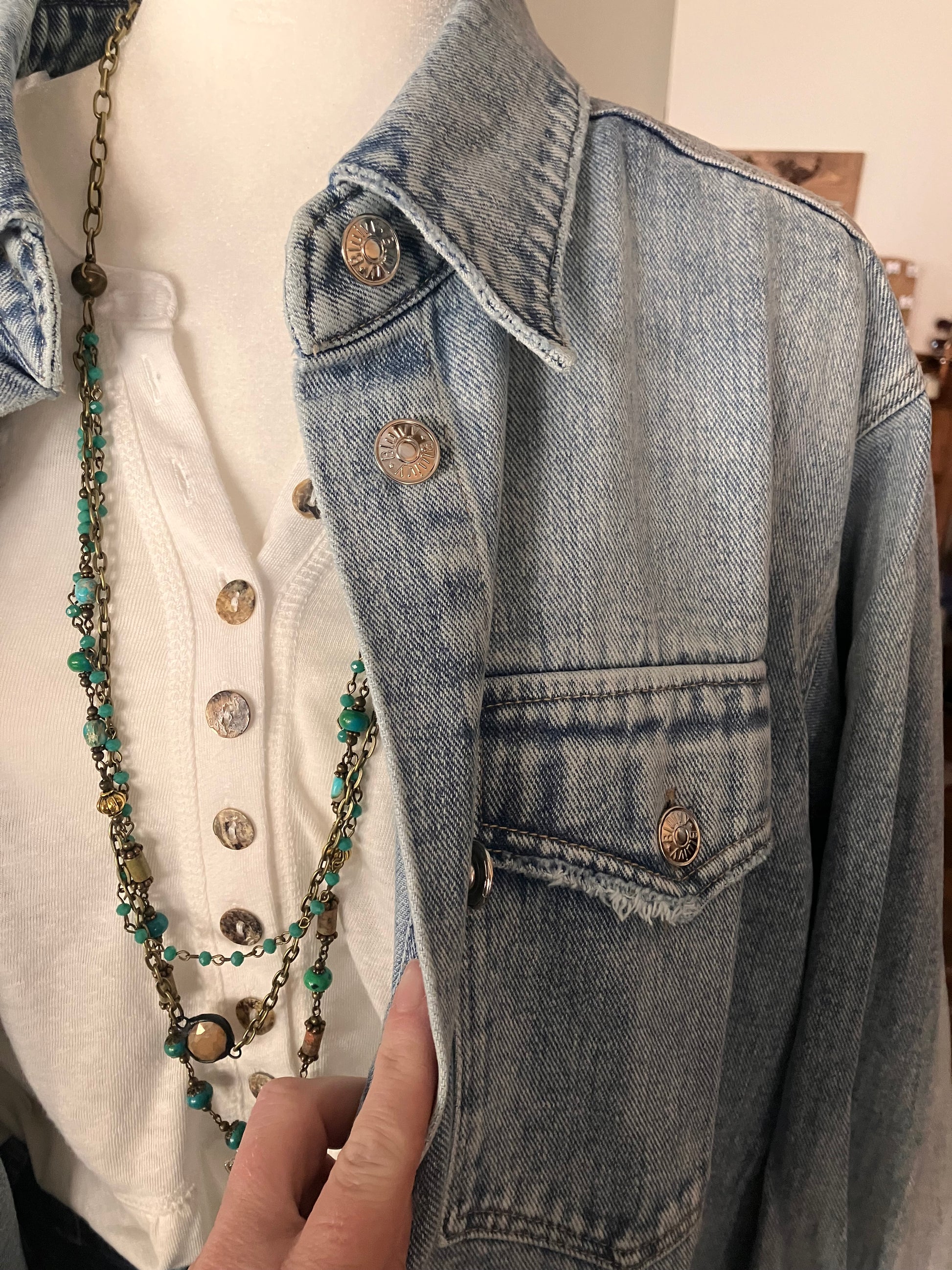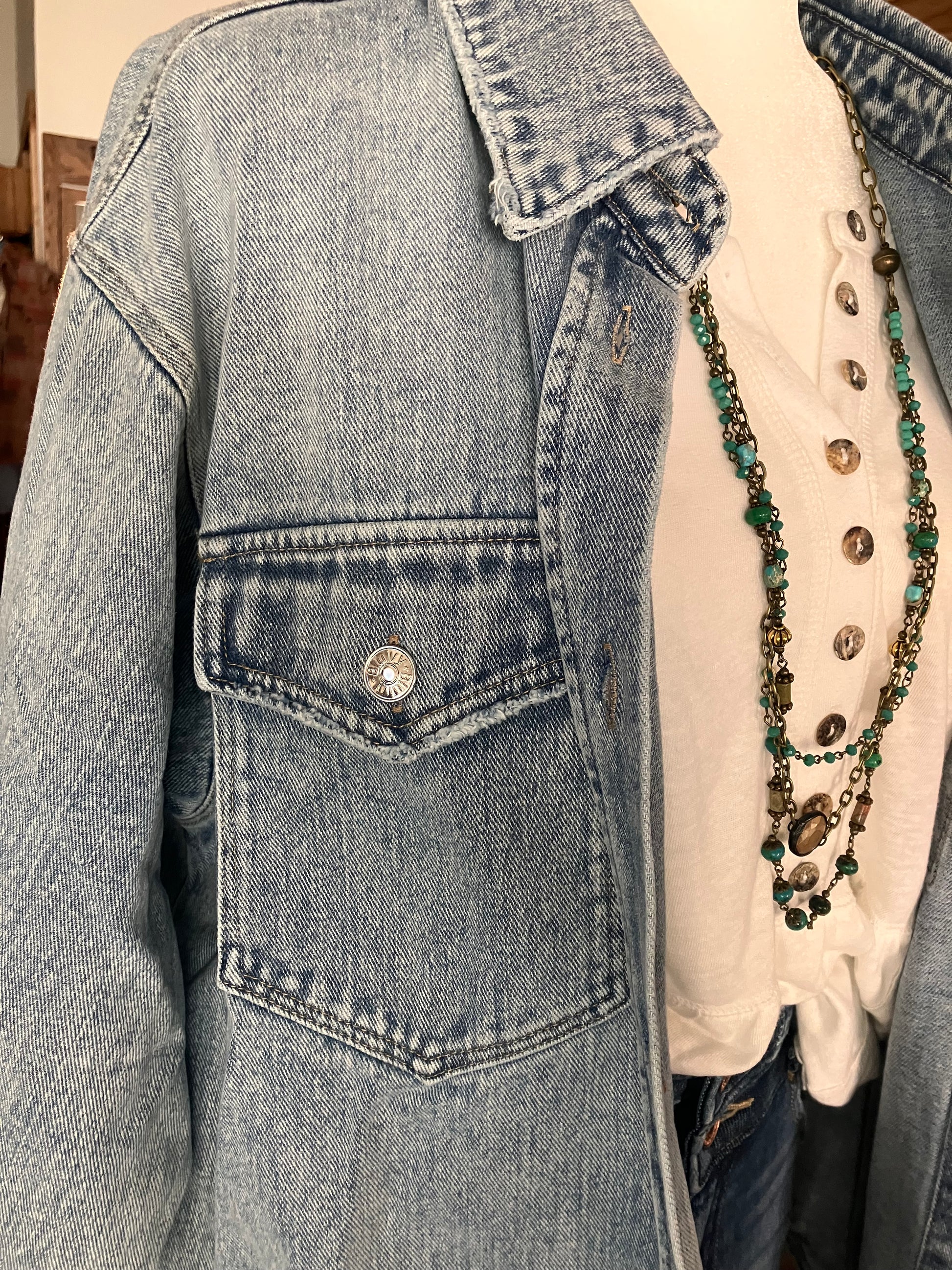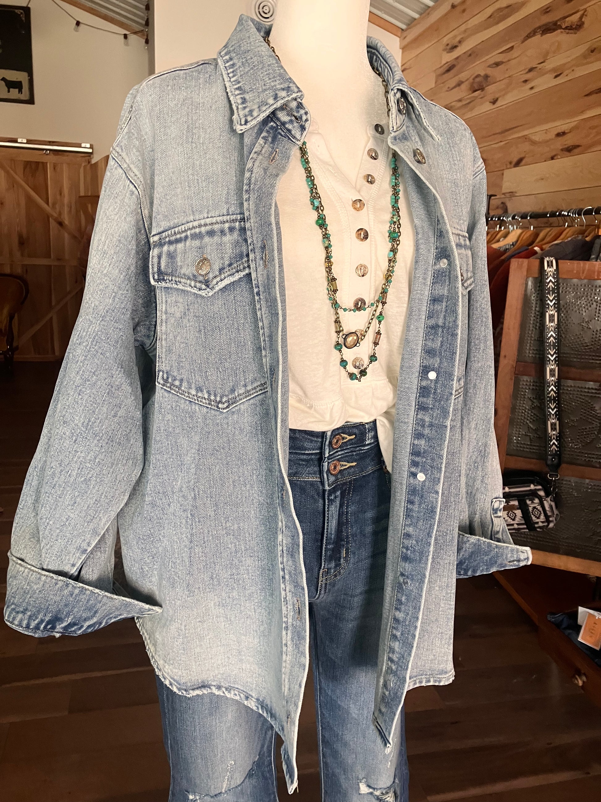 Washed denim button down shirt jacket. This casual yet stylish piece features a button-down front and is made from soft, washed denim for a comfortable fit. Its shirt jacket design offers versatility, allowing it to be worn as a shirt or layered as a jacket. Perfect for a laid-back, everyday look, this shirt jacket combines functionality and fashion effortlessly.