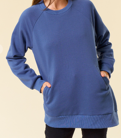Fleece Crewneck Asymmetric Sweatshirt W/ Front Pockets