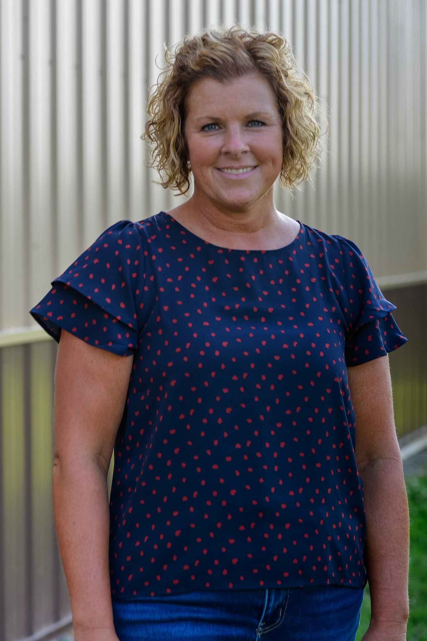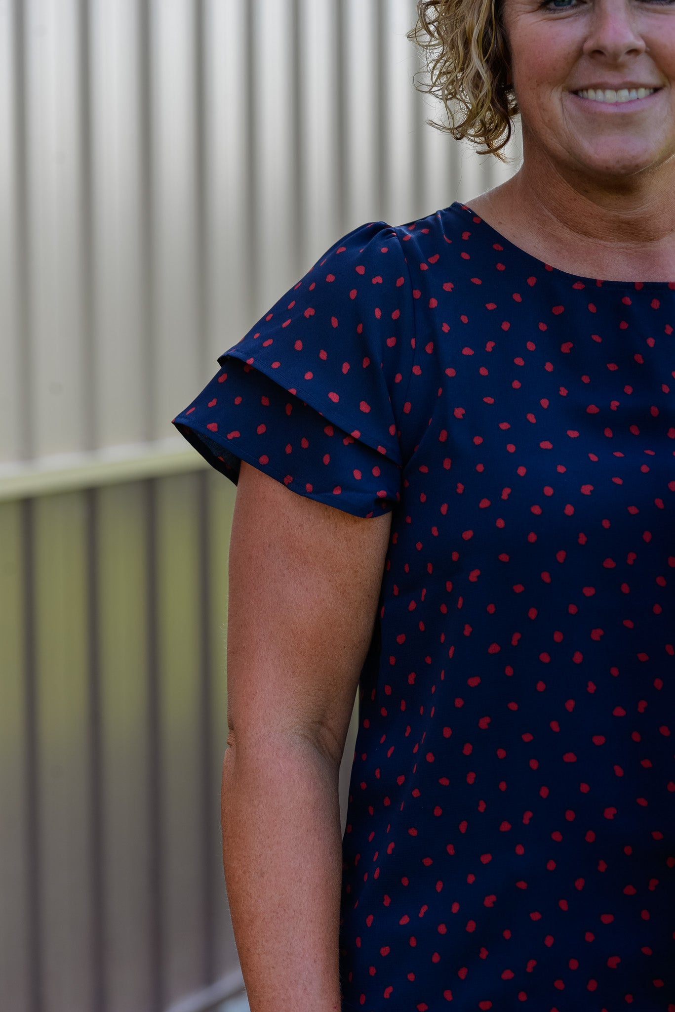 Add a playful yet polished touch to your wardrobe with this charming double ruffle sleeve top. Designed in a navy base with wine-colored dotted print, it brings a hint of whimsy to a classic silhouette.