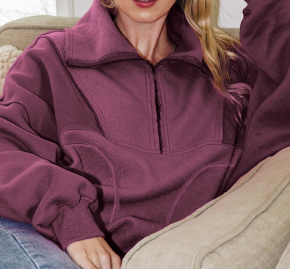 Zipper neckline relaxed fit sweatshirt featuring front pocket and long sleeve with ribbed cuff and bottom hem.