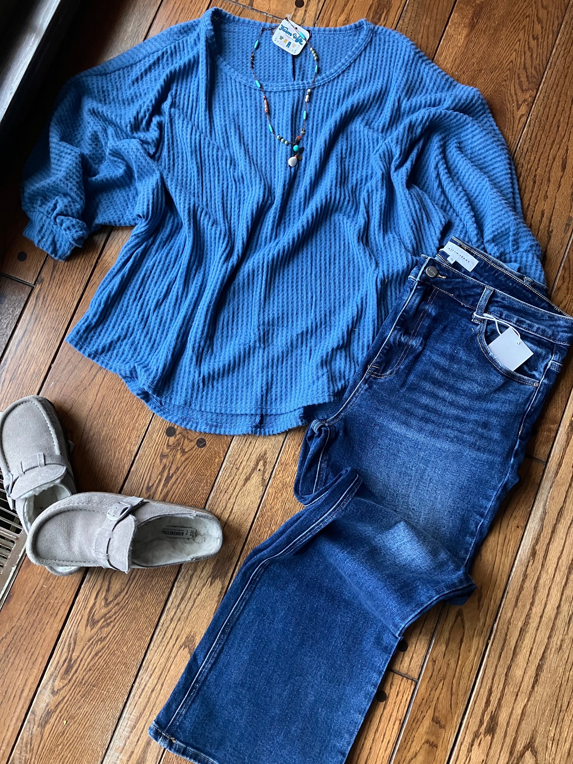Waffle knit, tunic top in a loose fit with a round neckline and 3/4 length bubble sleeves in blue.