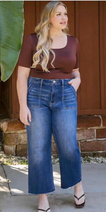 Elevate your casual style with these must-have Plus Size High Rise Crop Utility Jeans! Crafted from comfort stretch denim, they feature a flattering high-rise waist, trendy utility pocket detailing, a raw hem, and a modern cropped length. The straight-leg fit makes them perfect for pairing with your favorite sneakers or booties for a laid-back yet stylish look.