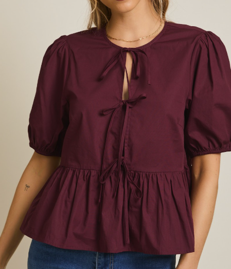 Add a romantic touch to your wardrobe with this elegant wine-colored blouse featuring delicate front tie details and soft puff half sleeves. The lightweight fabric drapes beautifully, creating a flattering and feminine silhouette that's perfect for any occasion.