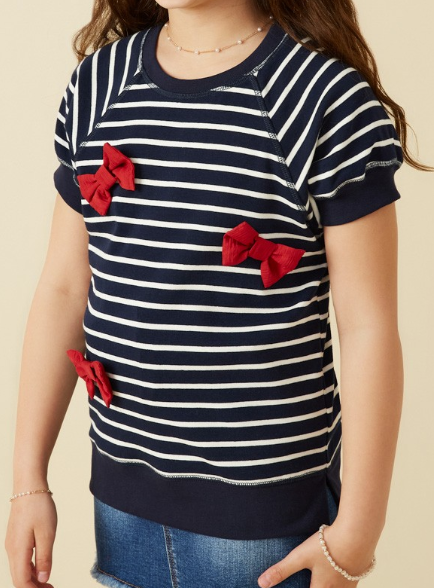 Girls Contrast Bow Detailed Striped Knit T Shirt *Stripe Knit Fabric *Round Cut Neckline *Short Sleeve