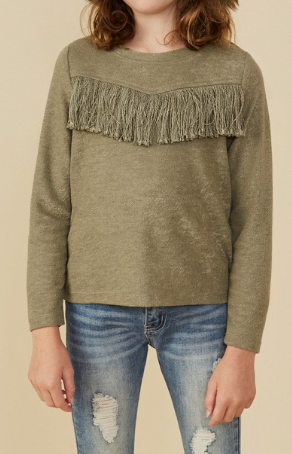 Girls Fringed Textured Knit Pullover Top *Textured Knit Fabric *Round Cut Neckline *Cuff Sleeve