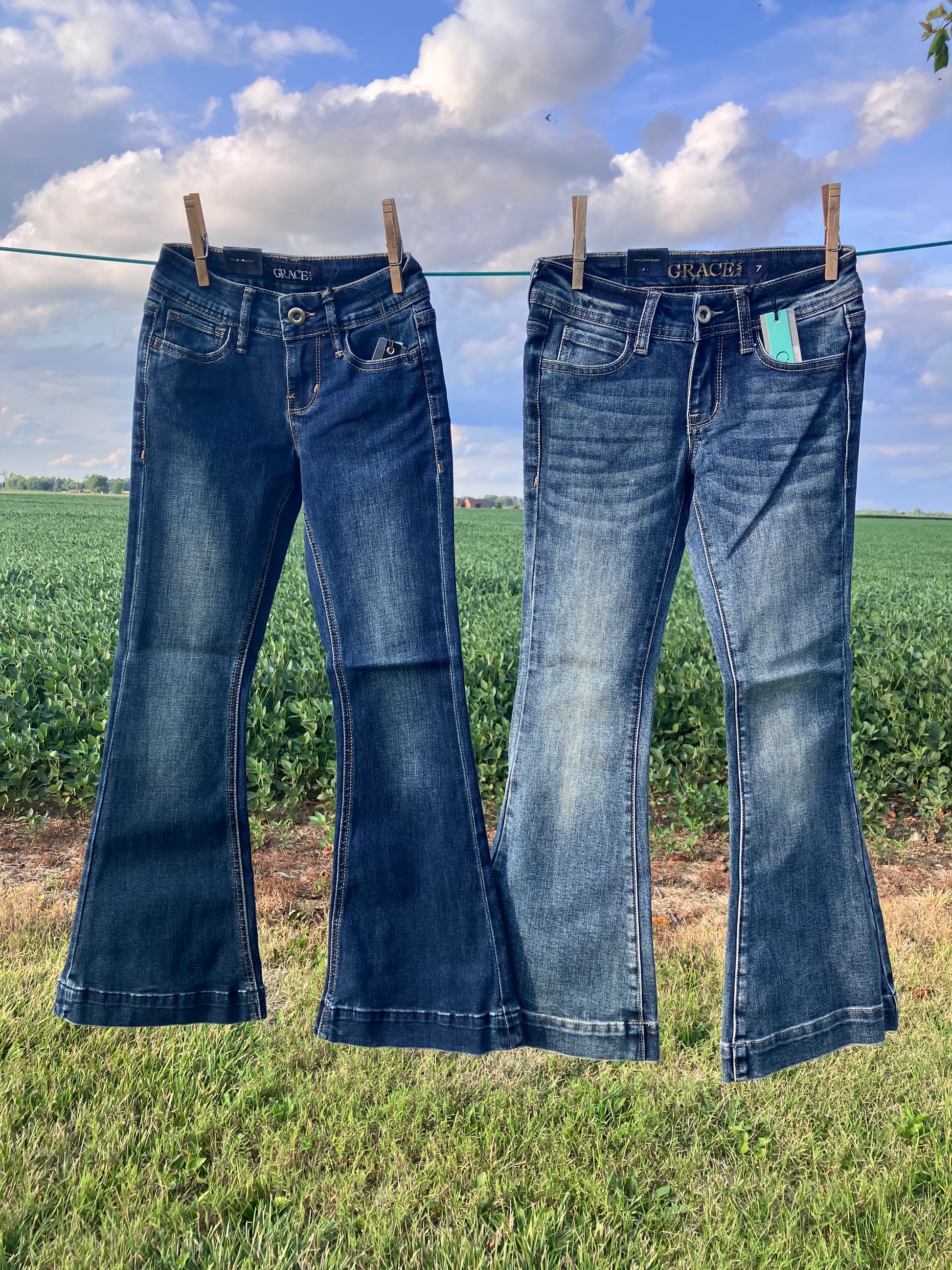Grace in La youth dark wash denim with flare hem. Super sleek jeans with no distressing. Delicate gold stitching on seams.