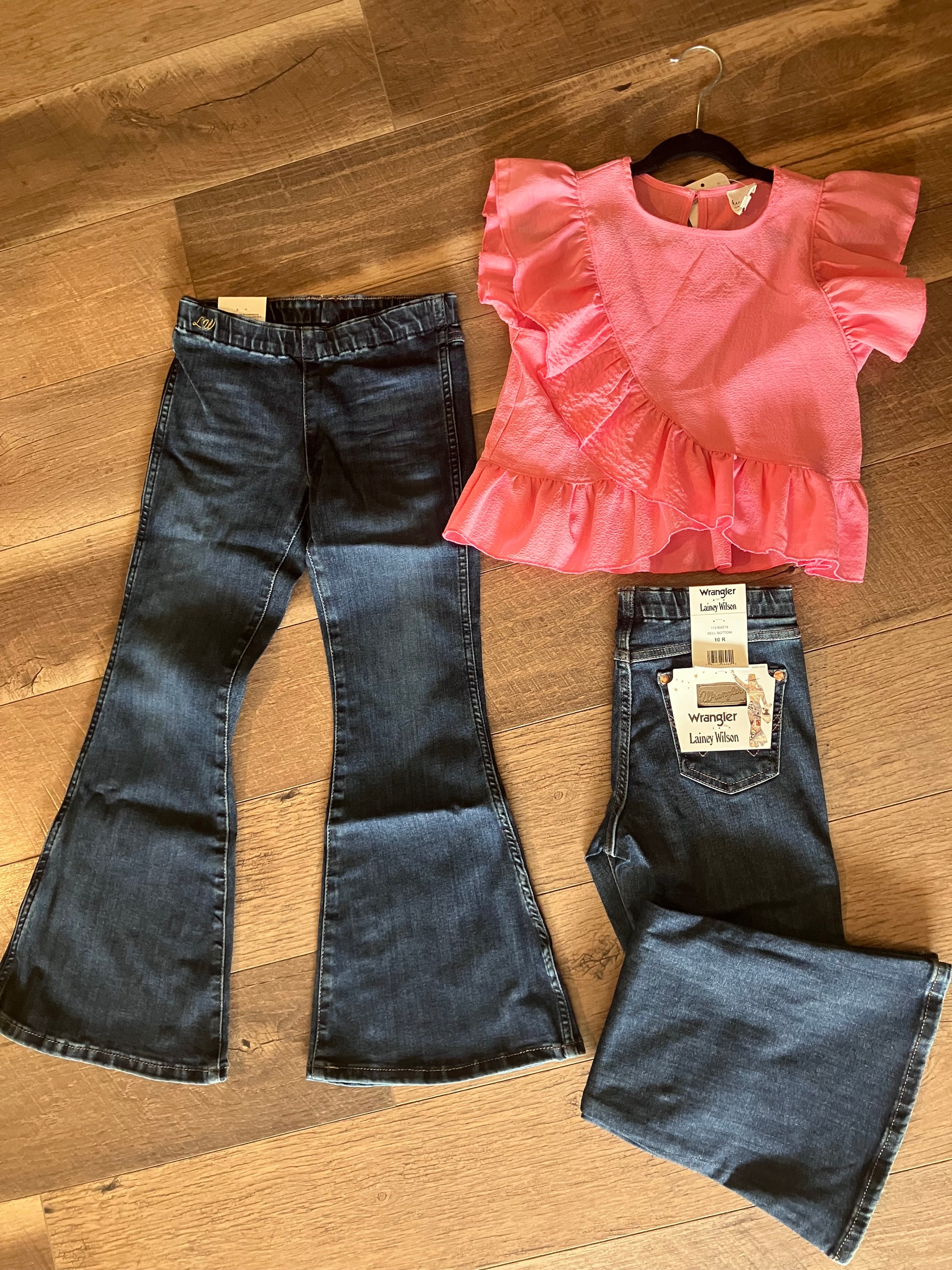 Inspired by her signature silhouette, the Girl’s Wrangler® x Lainey Wilson Pull On Bell Bottoms double down on the singer-songwriter's playful flair and untamed spirit. These jeans take a few cues from the Retro Trumpet Flare but with a pull-on, high-rise waist and fuller bell bottom, as well as the ‘W’ stitching on the back pockets and a logo patch. You’ll also find Lainey’s “LW” initials embroidered at the hip in honor of how hands-on she was in the creation of every collection piece, including this one. Blaze trails with all you’ve got, starting with these.
