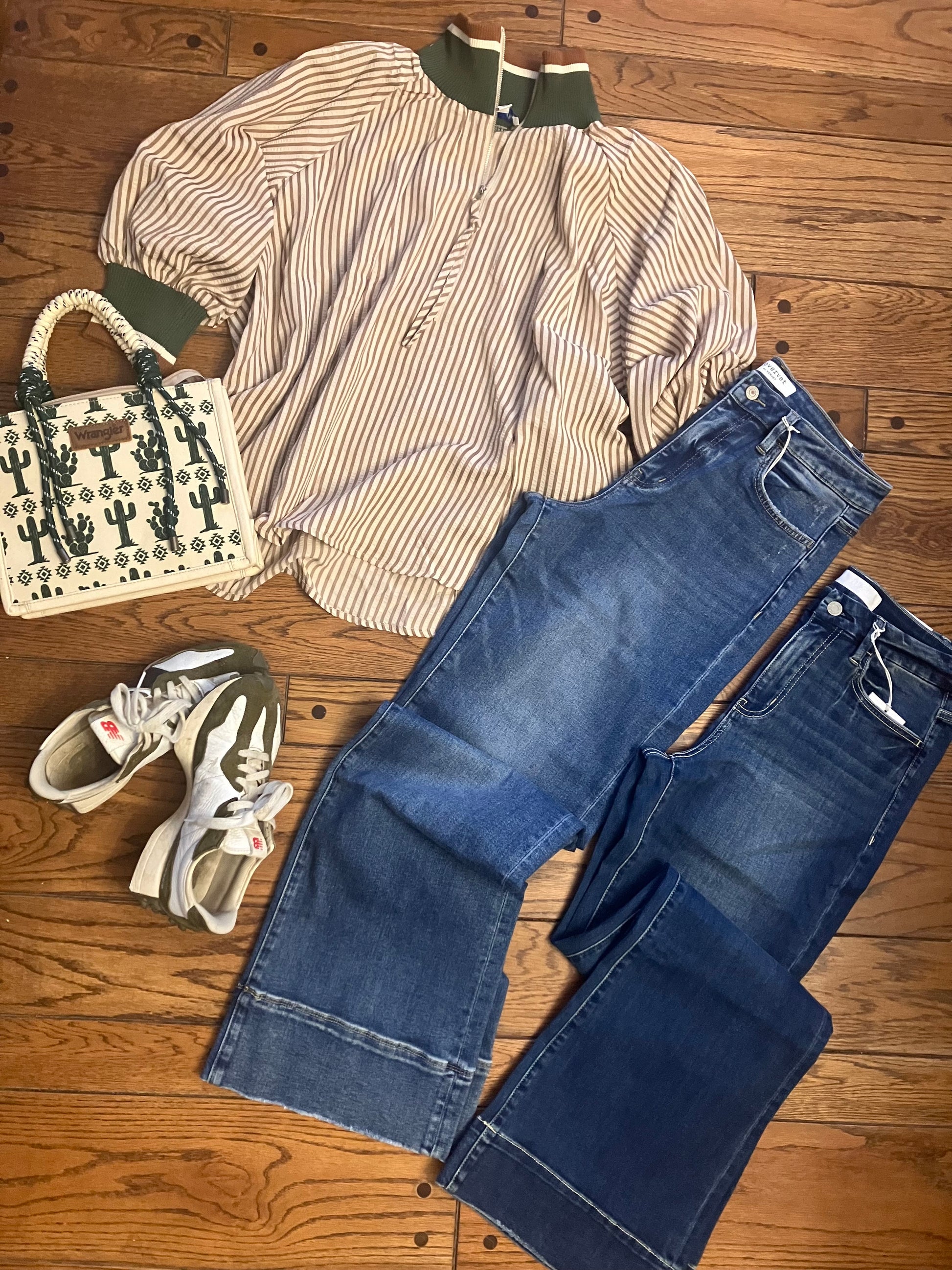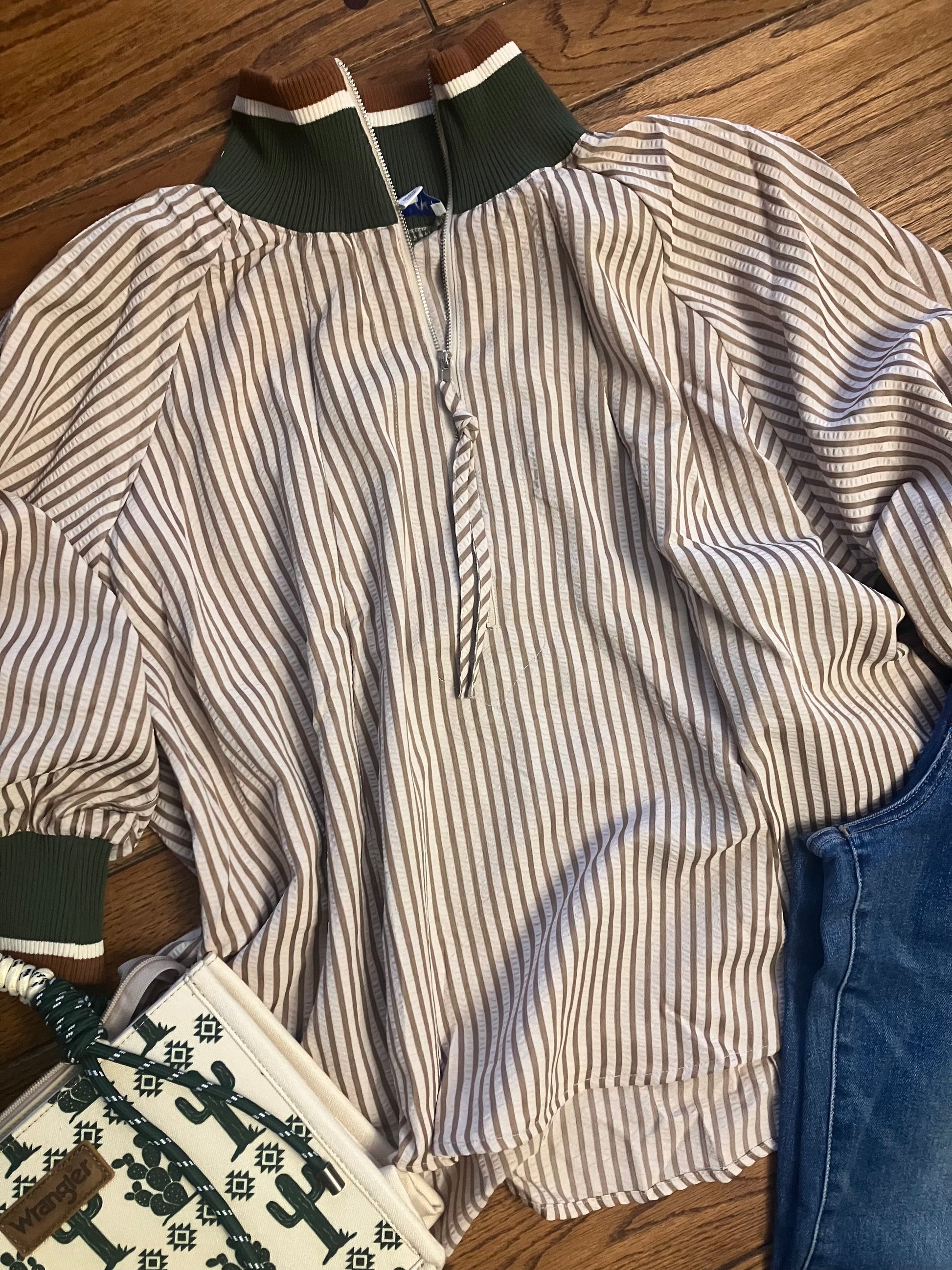 3/4 SLEEVE HALF ZIP STRIPED TOP