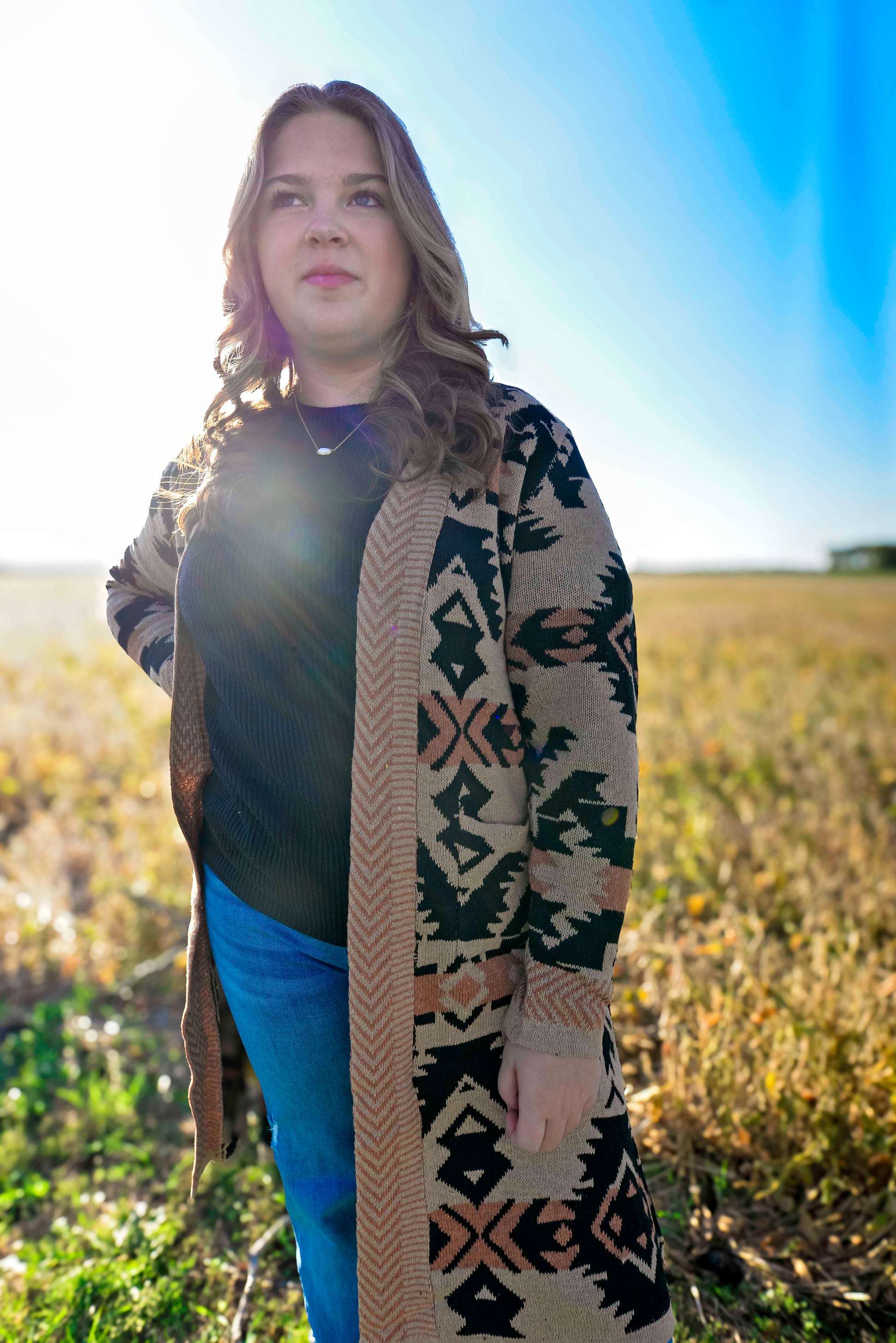 Cardigan Sweater Long Sleeve with Waist Belt Aztec Pattern.