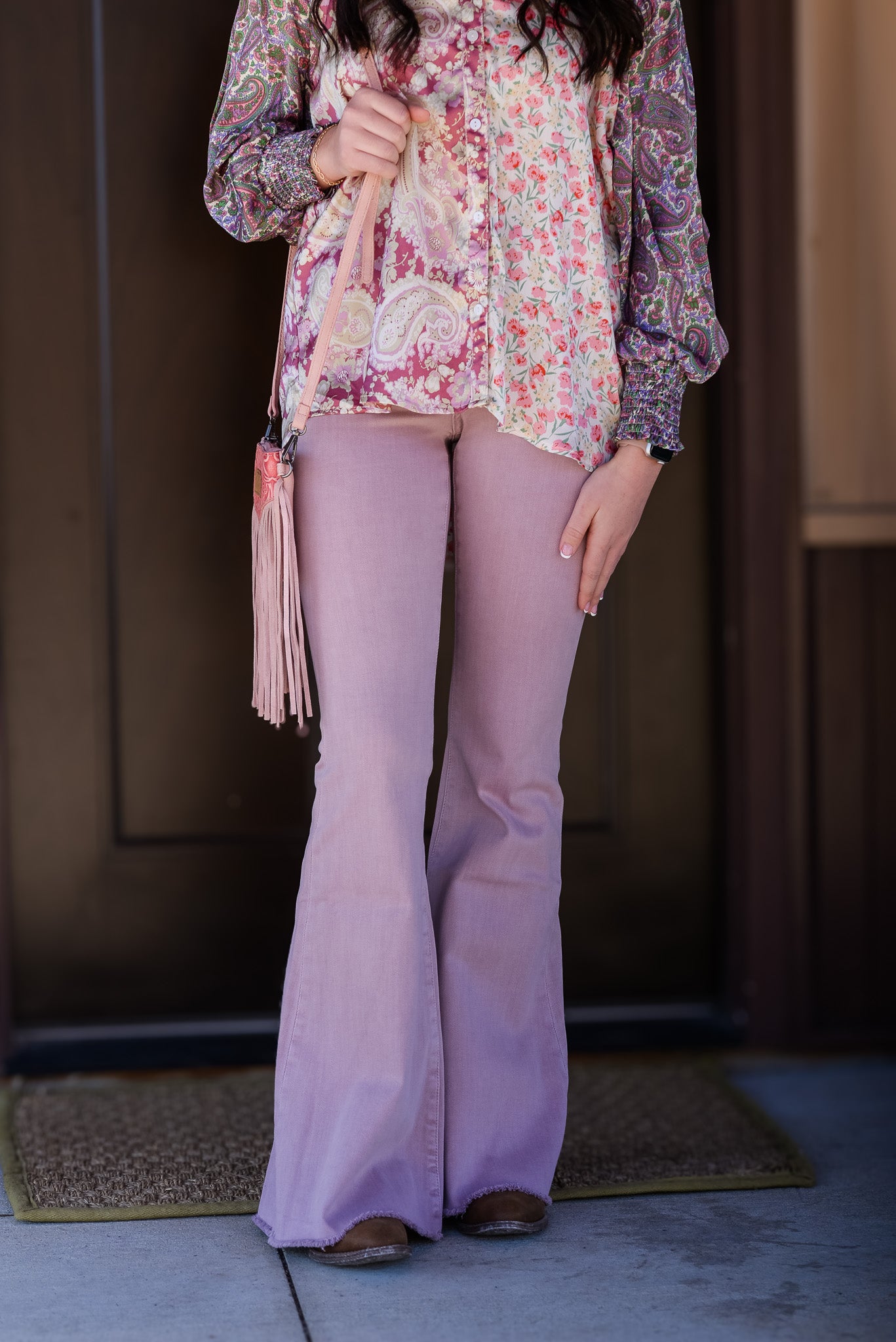 The Lady Lavender flares are so dreamy! They are buttery soft and stretchy at the waist with the right amount of color to make them stand out. Vervet has created a true flare that is fitted at the thigh then flared from the knee. The raw hem also gives you the option to trim them up if needed.