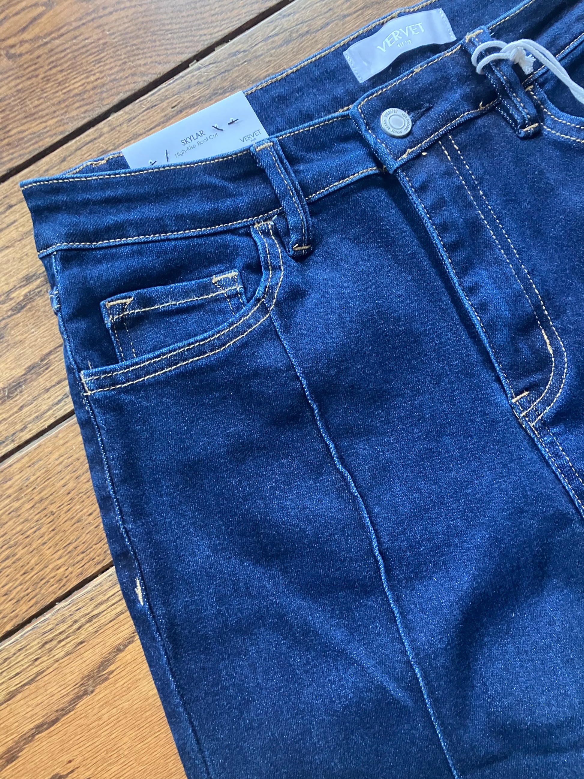 The front pin tuck seam detail elongates the legs for a flattering finish, while the bootcut leg opening gives them a versatile style that pairs effortlessly with heels, boots, or sneakers. A clean trouser hem and high rise waist make these jeans a chic go-to for both casual and polished looks.