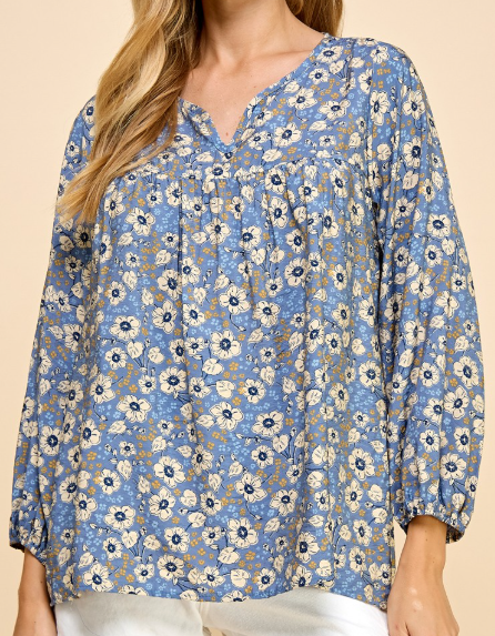 Floral Top with V Neck in a denim pattern.