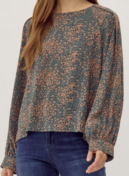 Floral print top with U-neck, back key hole, seam-line long bubble sleeves, and buttoned cuffs. - Non-sheer, lightweight.