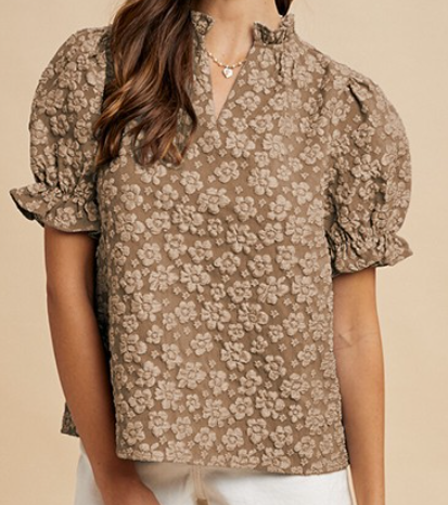 Elevate your look with this elegant floral satin jacquard blouse. Designed with a ruffle-detailed V-neckline and feminine puff sleeves, it offers a sophisticated yet effortless style. The relaxed fit ensures comfort while the subtle sheen of the jacquard fabric adds a touch of luxe. Perfect for both workwear and special occasions.