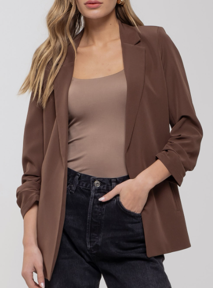 The Lincoln blazer is a solid lined chocolate blazer with 3/4 ruched sleeves and notch collar shawl.