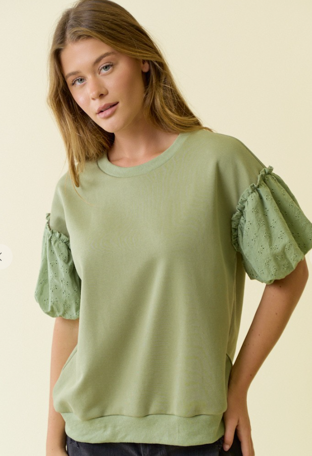 COTTON EYELET CONTRAST SHORT SLEEVE SWEATSHIRT - Soft short-sleeve sweatshirt body with relaxed, easy fit - Contrast cotton eyelet puff sleeves with delicate floral cutout detail - Ribbed crew neckline, hem, and sleeve cuffs for a clean finish - Lightweight knit body pairs comfortably with the structured eyelet sleeves 60%COTTON 40%POLYESTER | LINING:100%POLYESTER