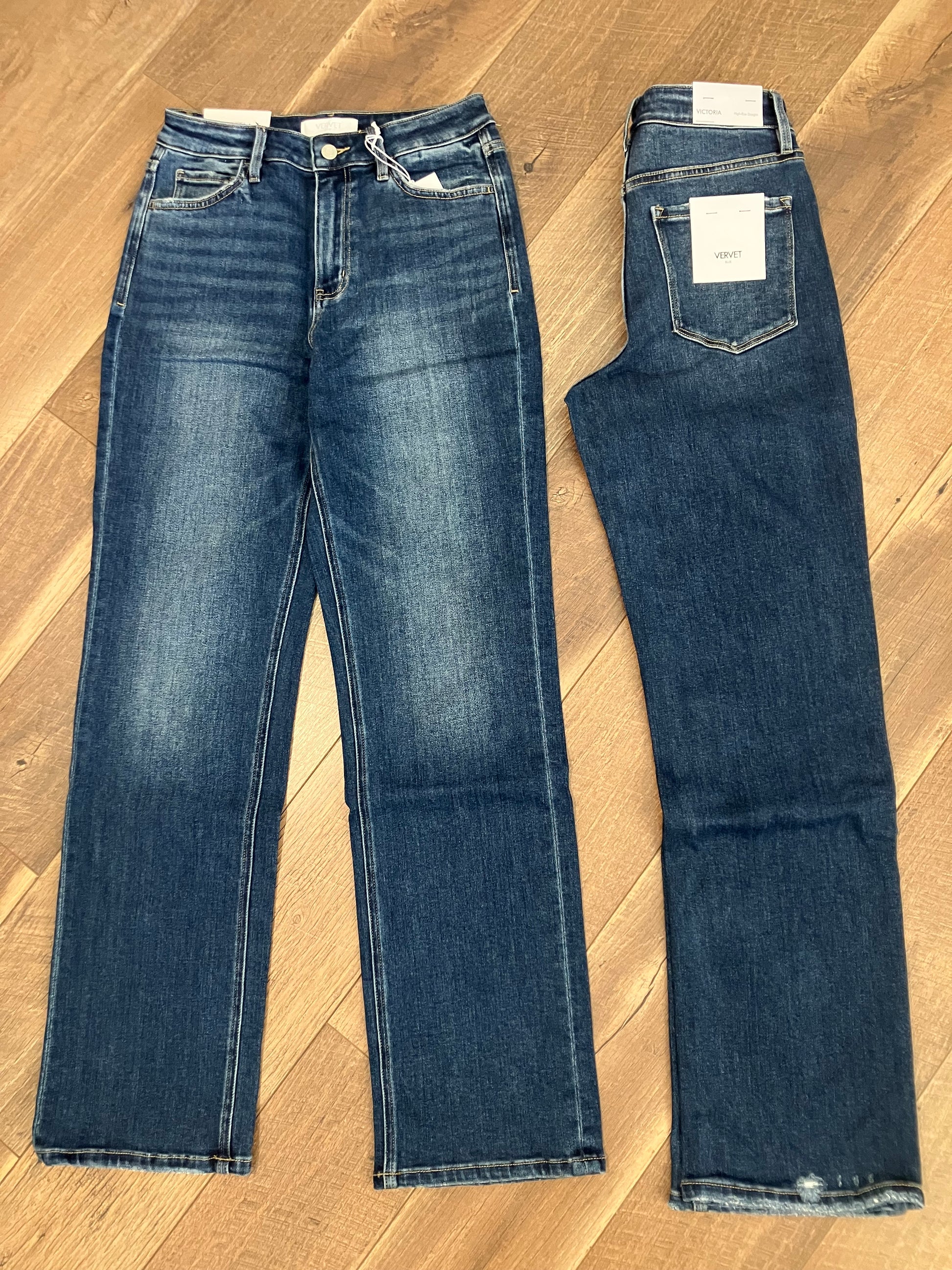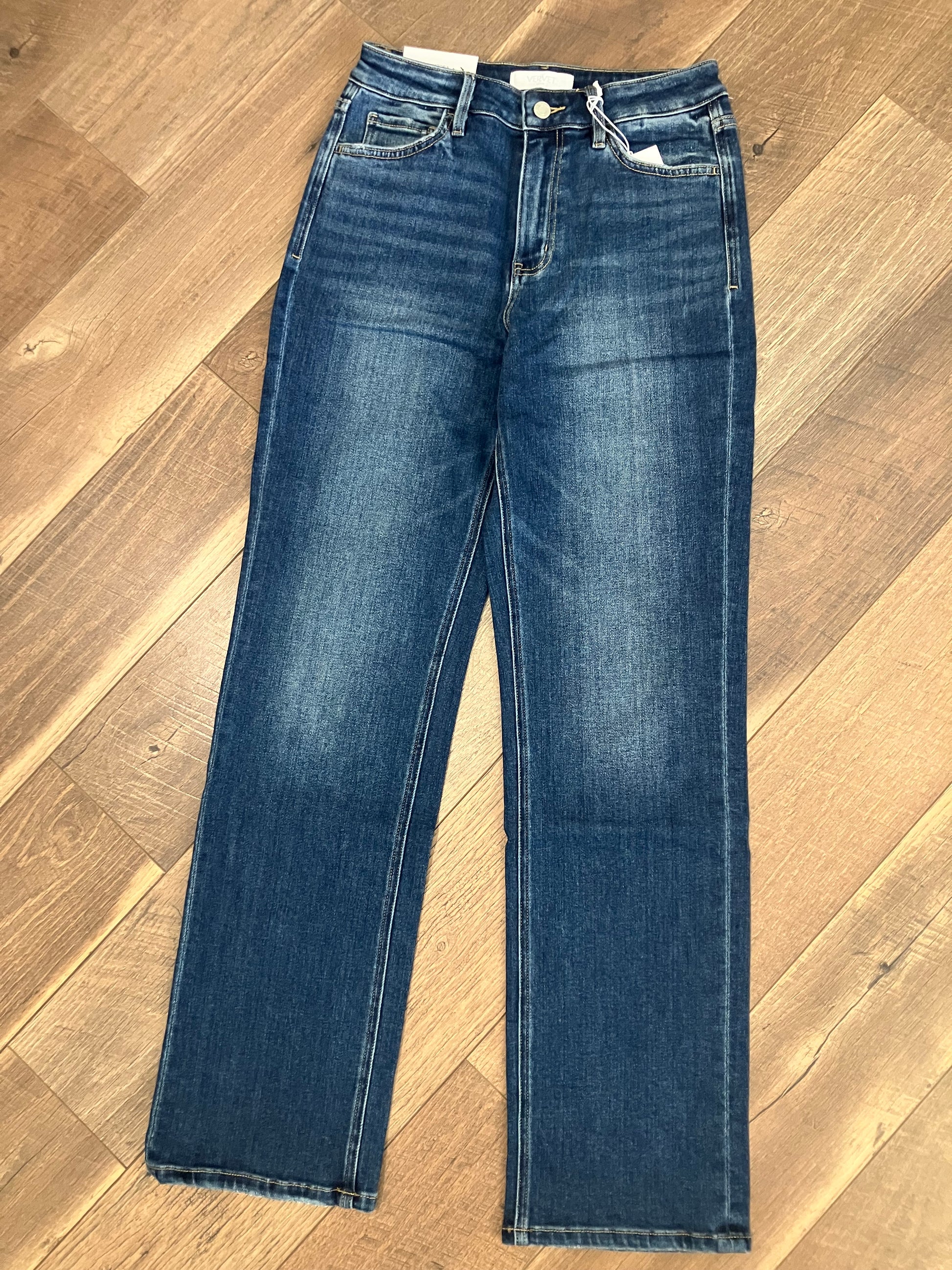 The Pace jeans by Vervet are high rise, dark wash with slight distressing on back hem. Full length and comfort style for everyday wear.