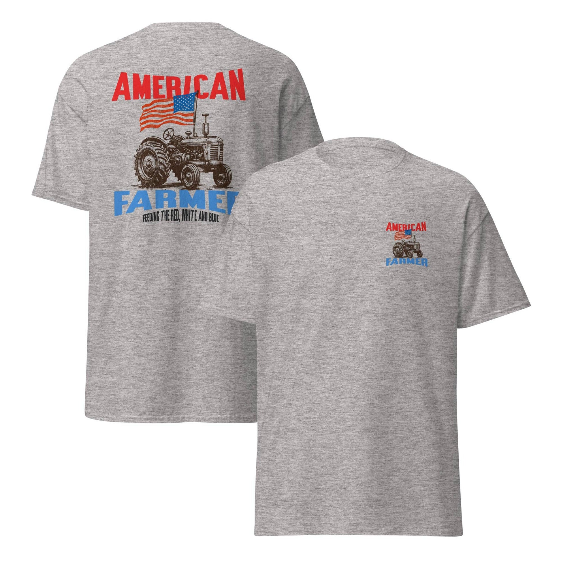 Celebrate the hardworking 'American Farmer' while showing your patriotic pride with this grey tee. Featuring a graphic of a tractor with the American flag and the phrase 'feeding the red white & blue', this Gildan tee is perfect for any casual occasion.