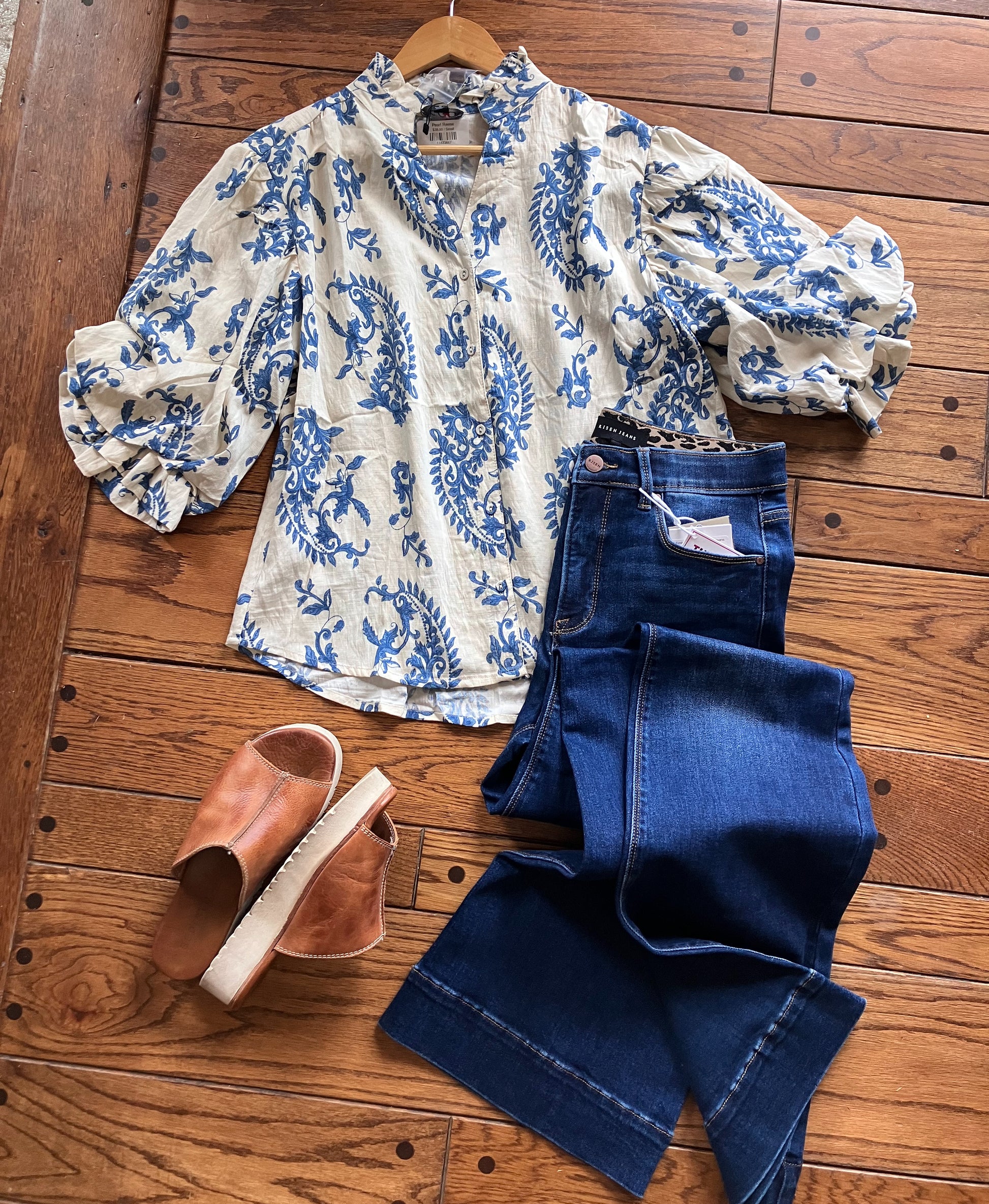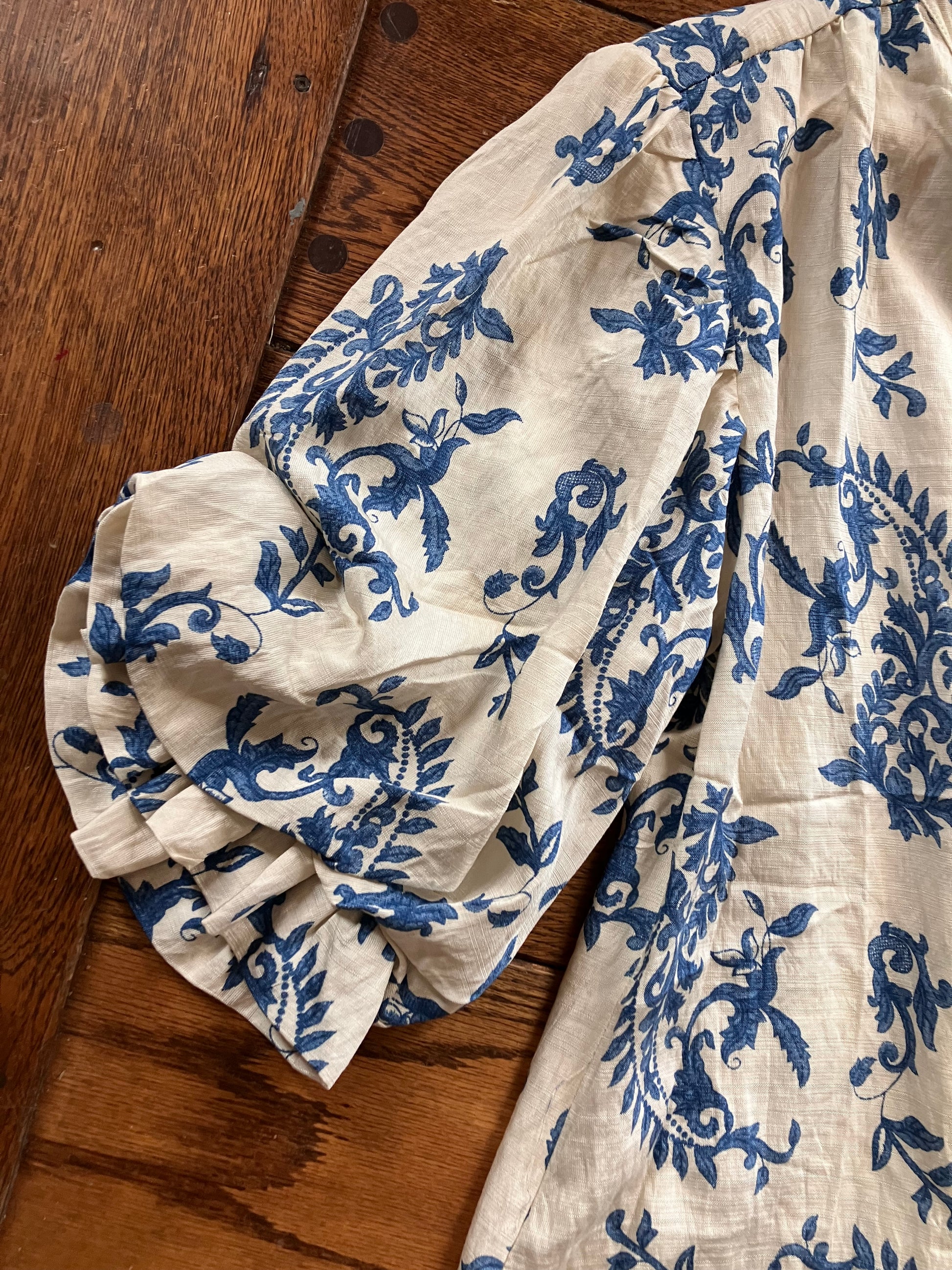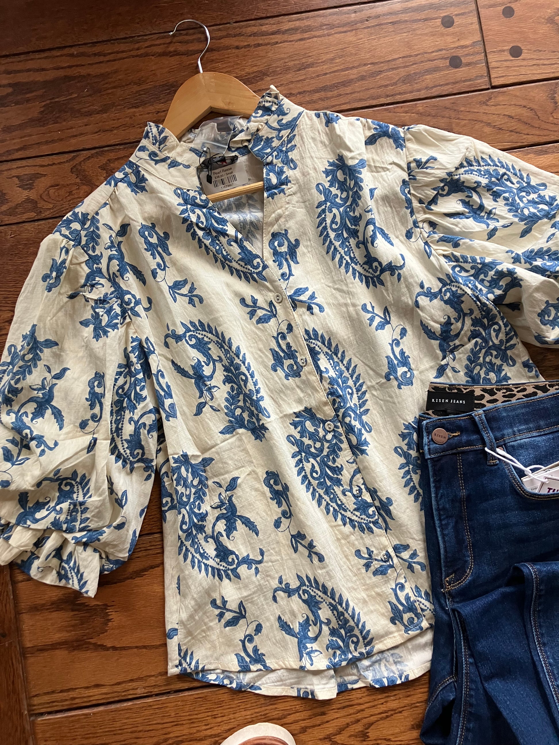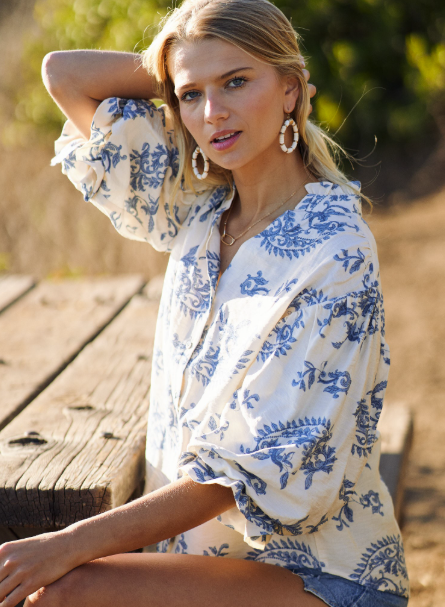 Button Down Blouse with 3/4 Length Balloon Sleeves.