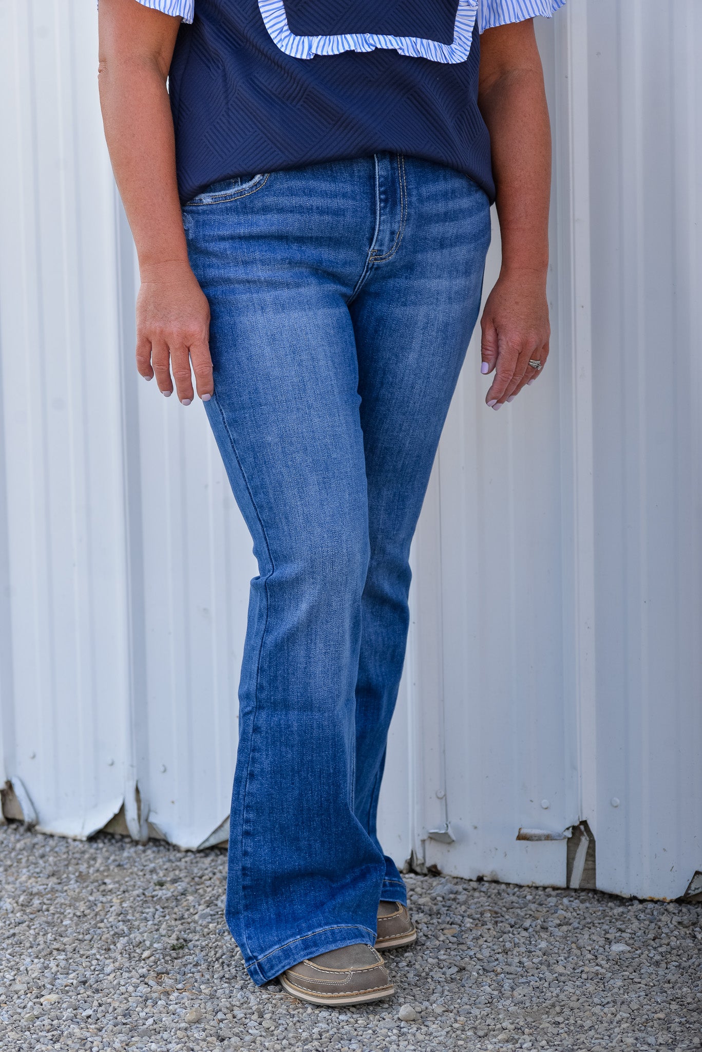 Petite Mid Rise Flare Jeans – Medium Wash by Kan Can