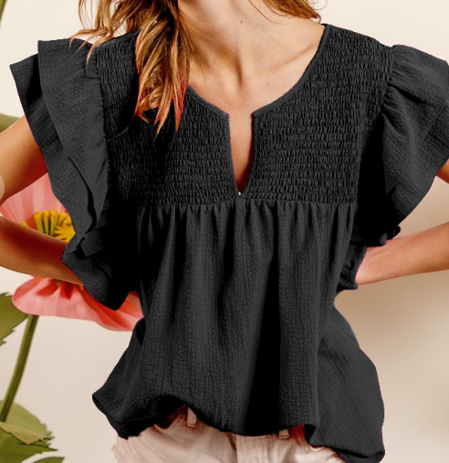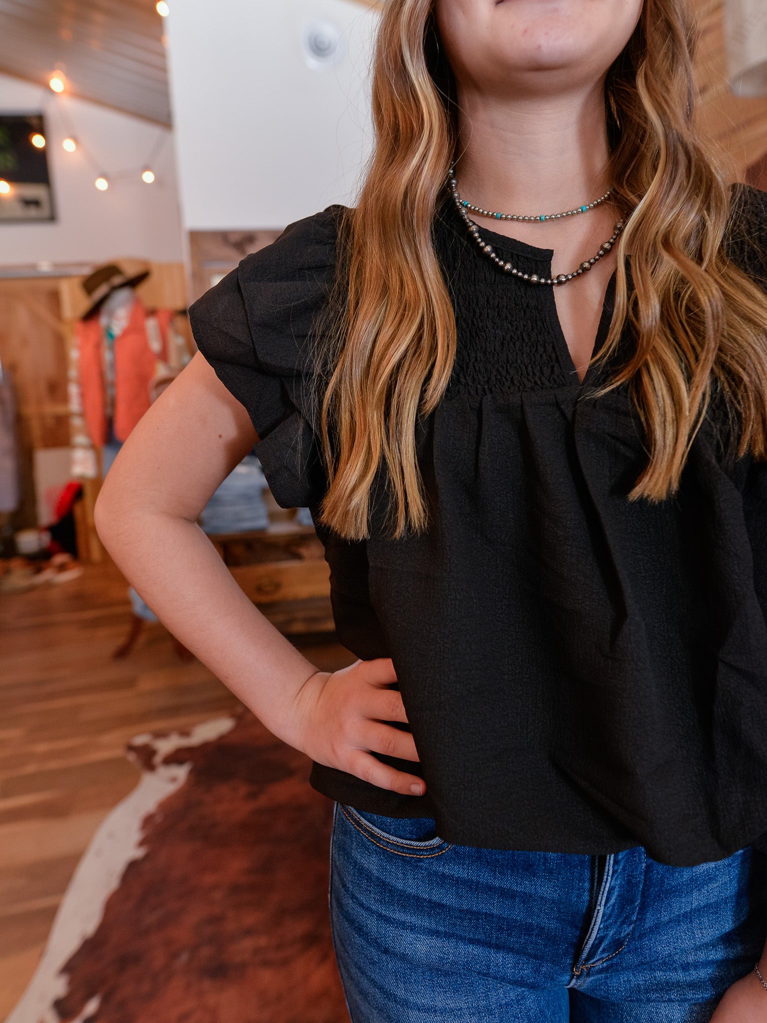 The Rambler top is a black top with a shirred bodice layered ruffle sleeve top. A versatile top that can be dressed up or down.