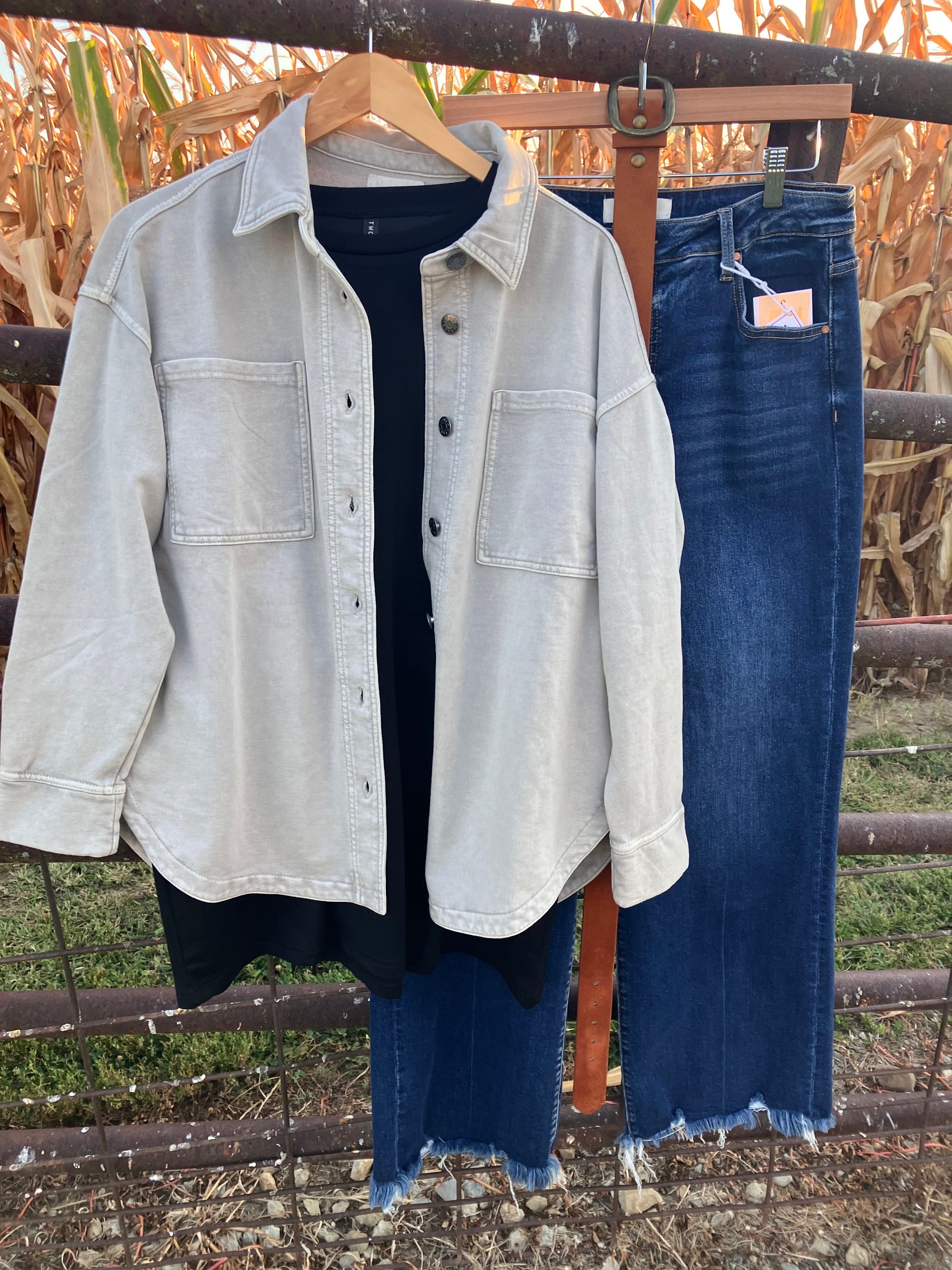 Ultra Soft Stretch Denim Look Shacket in grey.