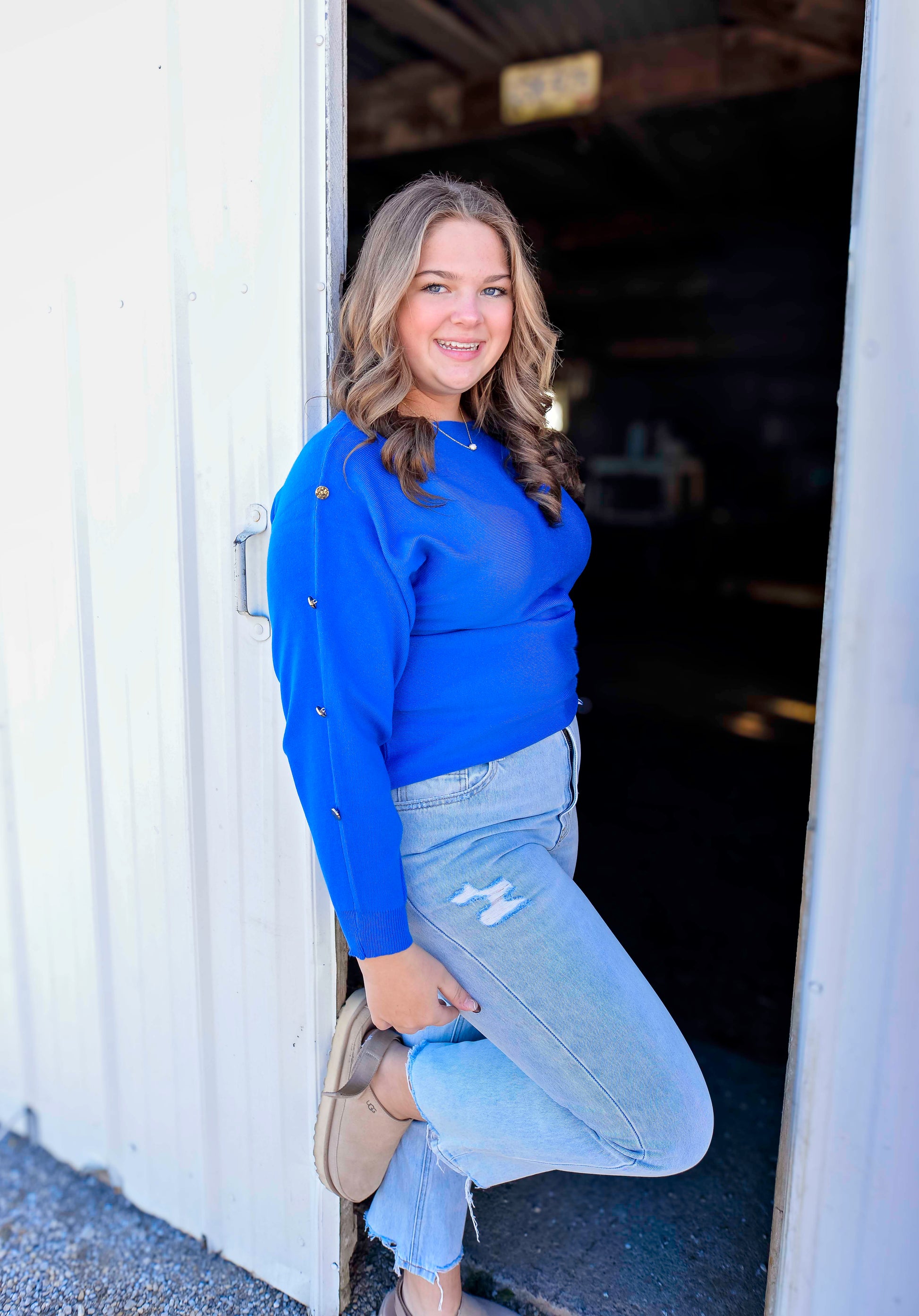 Dolman Sleeve Rib-knit Sweater Top with Shoulder Button in Royal Blue.