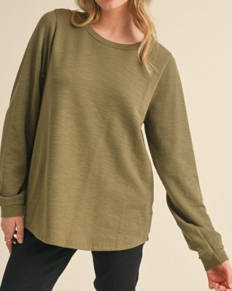Ribbed top with U-neck, back shirring detail, long sleeves, and ribbed cuffs. - Non-sheer, lightweight in Olive.