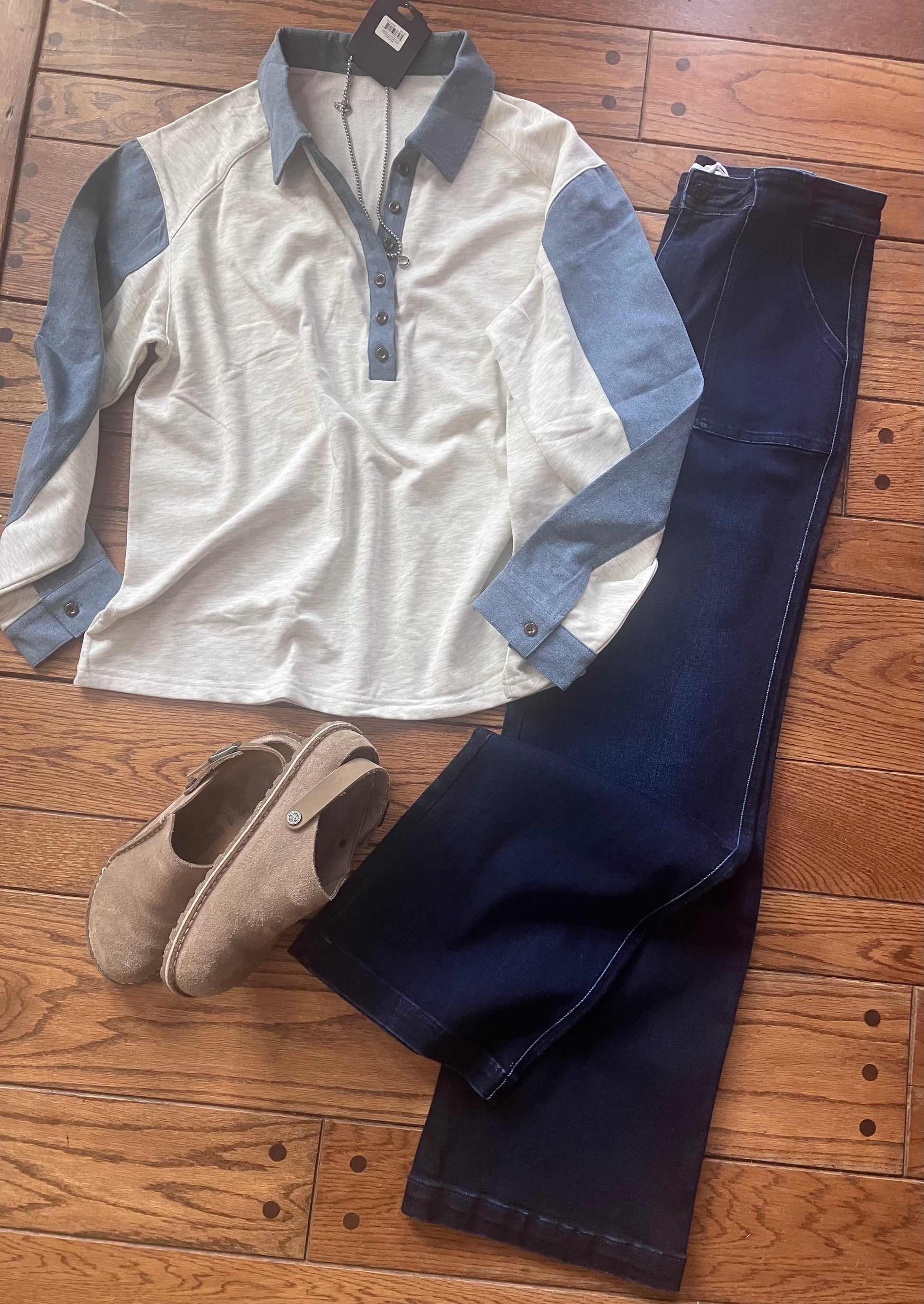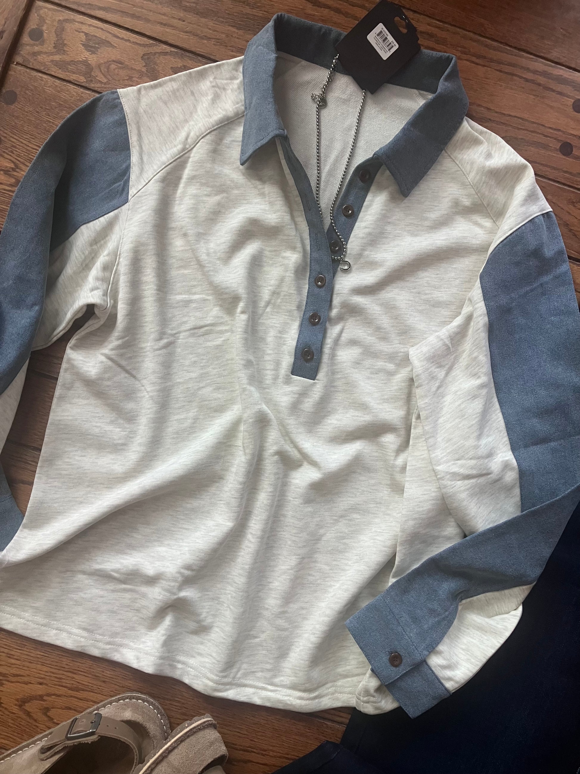 Color block patchwork gives this top a bold, standout look. Shirt collar and half-button front add a classic, polished touch. Long sleeves and relaxed fit keep it easy to wear and style.