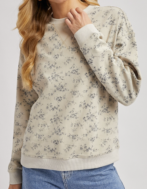 This effortlessly stylish crewneck sweatshirt is adorned with a delicate and subtle all-over faded ditsy floral print, lending it a touch of vintage charm. It maintains a classic sweatshirt silhouette with comfortable ribbed cuffs, a matching ribbed hem, and a finely ribbed crew neckline, further detailed with a small V-stitch accent at the front.