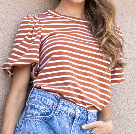 Effortlessly chic and playful, this Striped Top with Puffed Sleeves in adobe brings a modern twist to a timeless pattern. Made with a soft and stretchy cotton-spandex blend, it offers all-day comfort with a flattering fit.