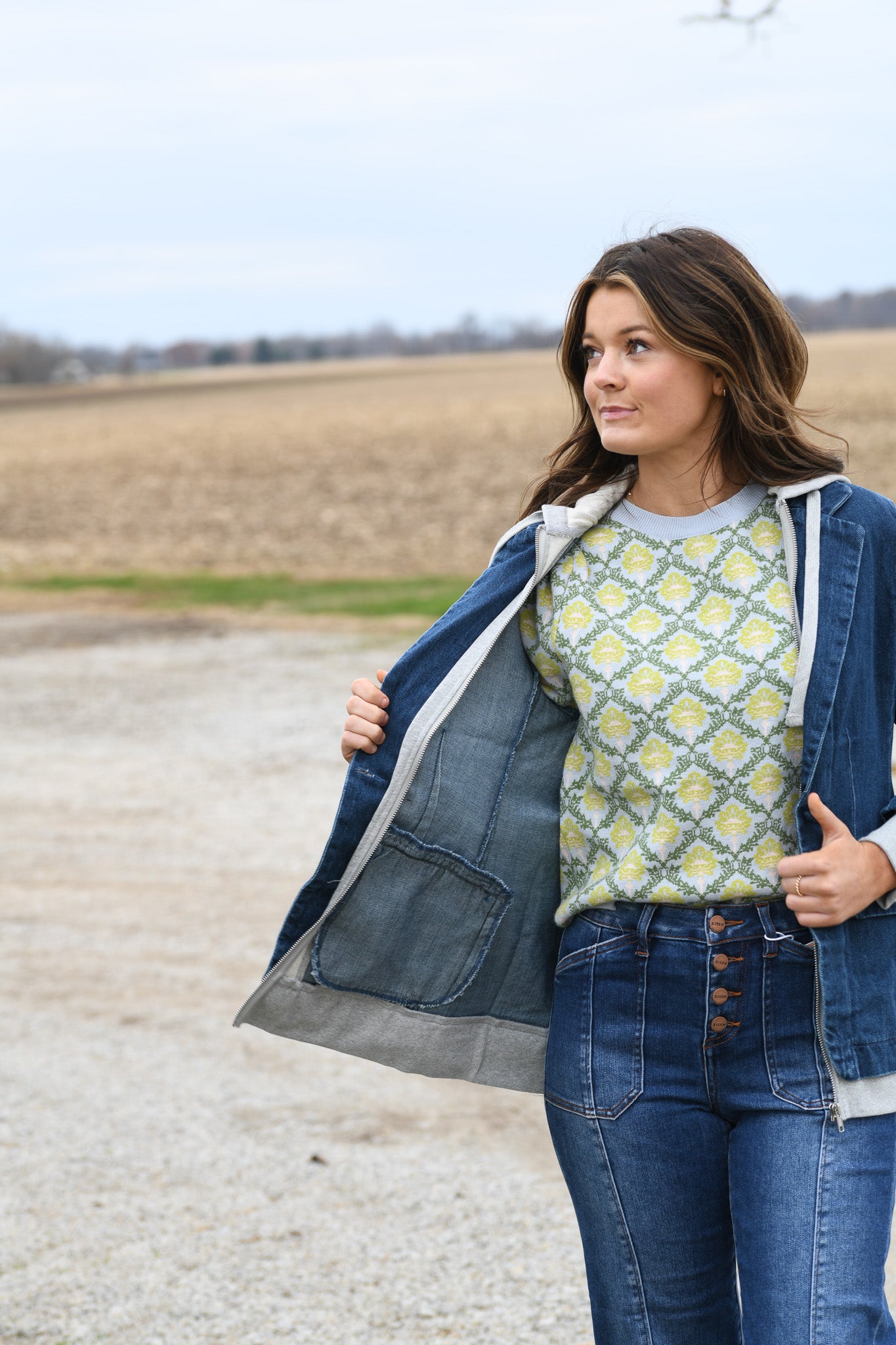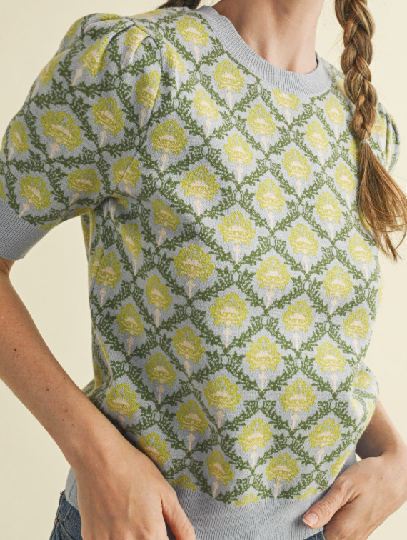 + Floral pattern short sleeve sweater + Round neckline + Short puff sleeves with ribbed cuffs + Vintage floral pattern + Relaxed fit pullover + Ribbed neckline, cuffs, and hem