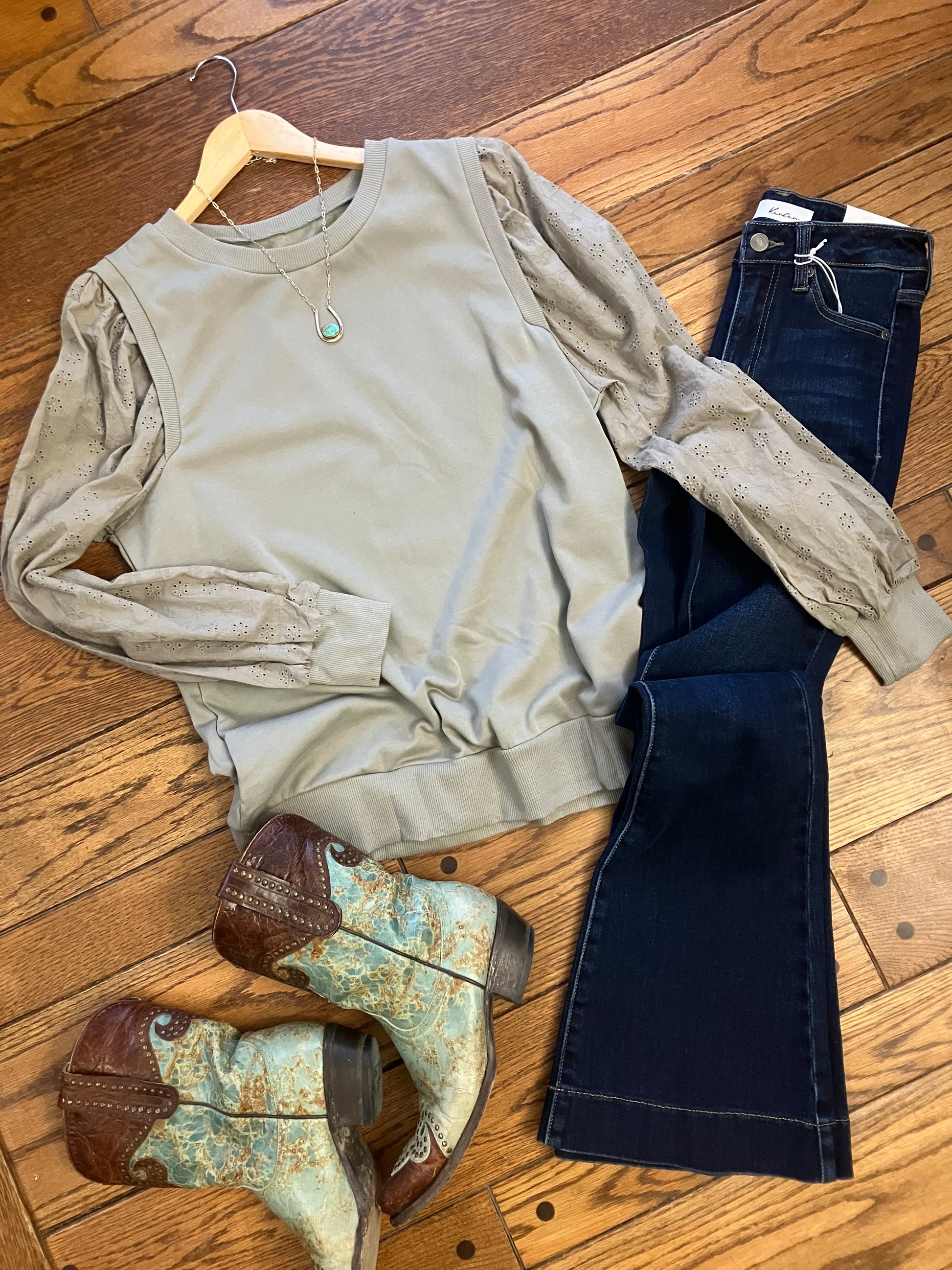 Eyelet embroidered sleeves add a touch of elegance. Unique patchwork design for a trendy look. Round neck for a classic and versatile style.