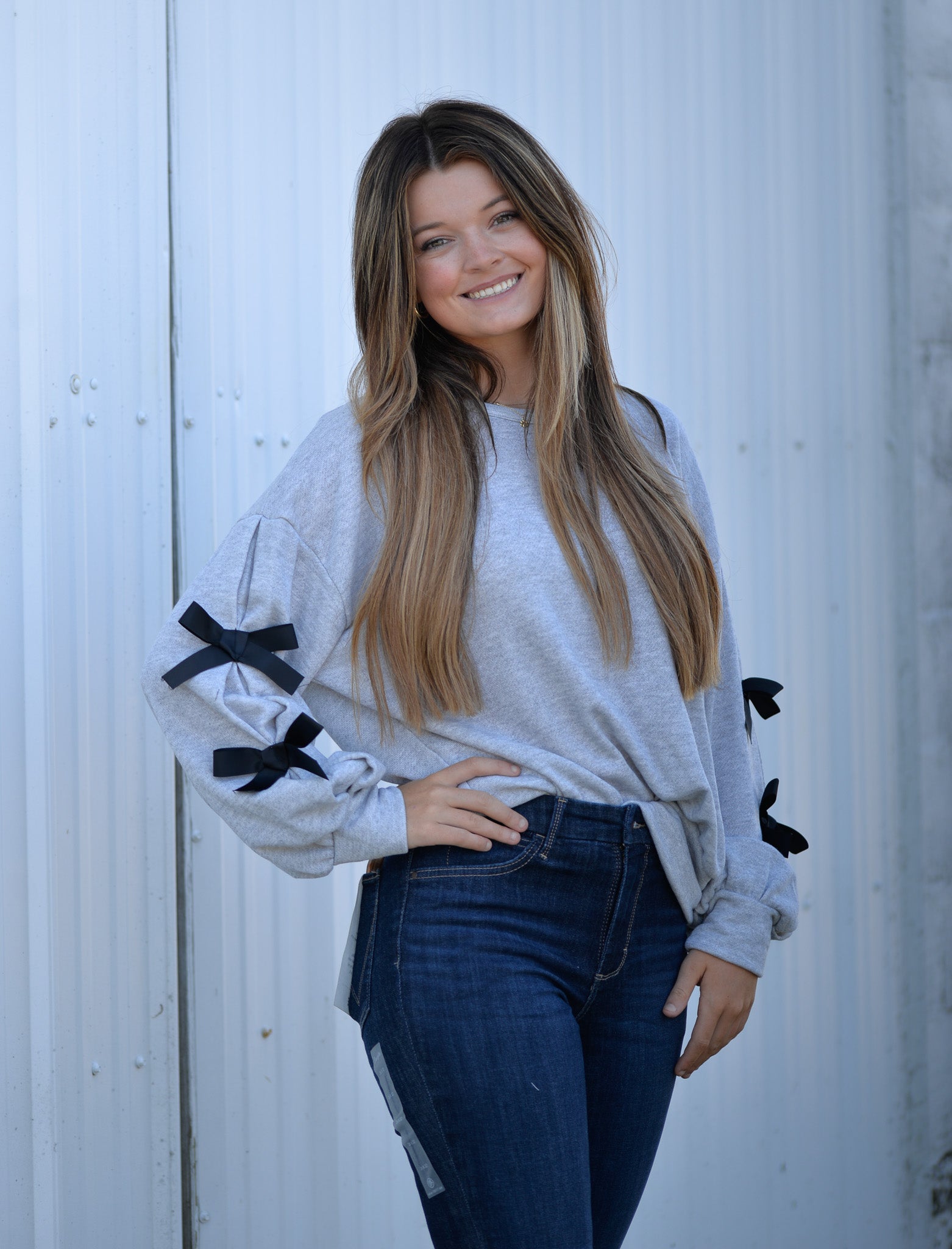 Add a touch of feminine charm to your casual look with this Solid Roundneck Sweatshirt featuring chic long ribbon tie sleeves. The soft, cozy fabric keeps you comfortable all day, while the bow-detailed sleeves bring a playful yet stylish twist to a classic silhouette.