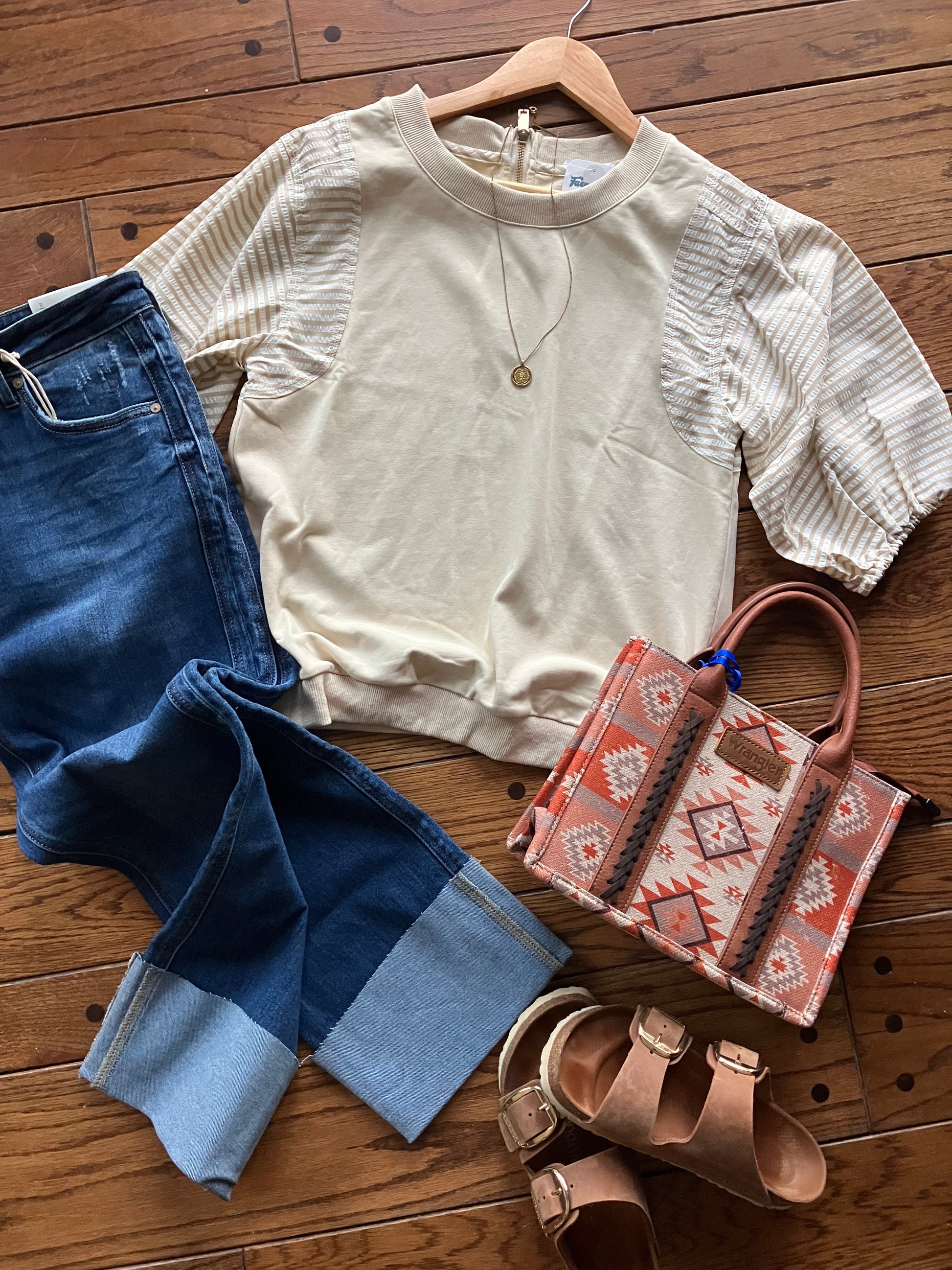Refresh your casual wardrobe with this mixed fabric sweatshirt, blending cozy comfort with playful style. Designed with a classic sweatshirt body and striped short puff sleeves, it adds a feminine twist to a timeless favorite. The back zipper closure offers both function and a modern touch, making it easy to wear while elevating the look. Perfect for pairing with jeans, skirts, or shorts, this versatile piece effortlessly transitions from casual outings to polished everyday wear.
